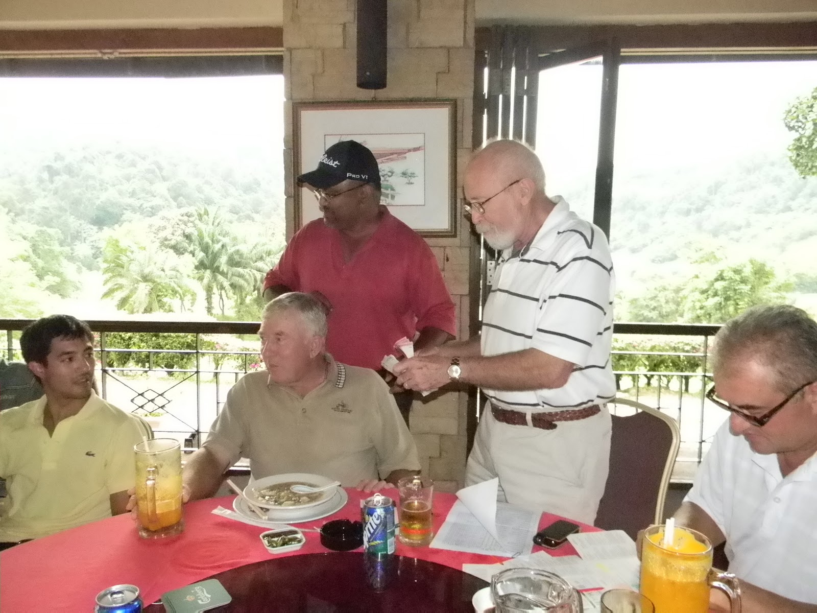 The annual pilgramage to play Royal Kampung Kuantan attracted 10 Cannons. The course was very quiet, in decent nick and the weather excellent – all in all a very pleasant stroll in the park. And the sprinkles of rain were not at all irksome. The degree of difficulty of this 9 hole ‘planters course’ is reflected in some fairly average scores. Winner was Ray Funnel with a gross 100 for 32 points and cut 4. R-up was Hans Berger with a gross 103 for 31 points and cut 1. Kevin Wiggins had the lowest gross with 93 and John Harvey played the most shots with 110. The details….