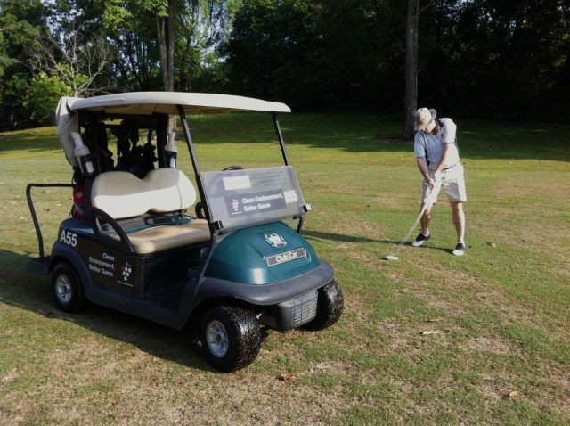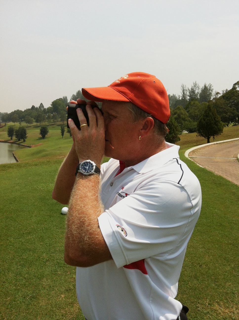 Geoff McLaws using some fancy optical sighting device to get a distance to the green