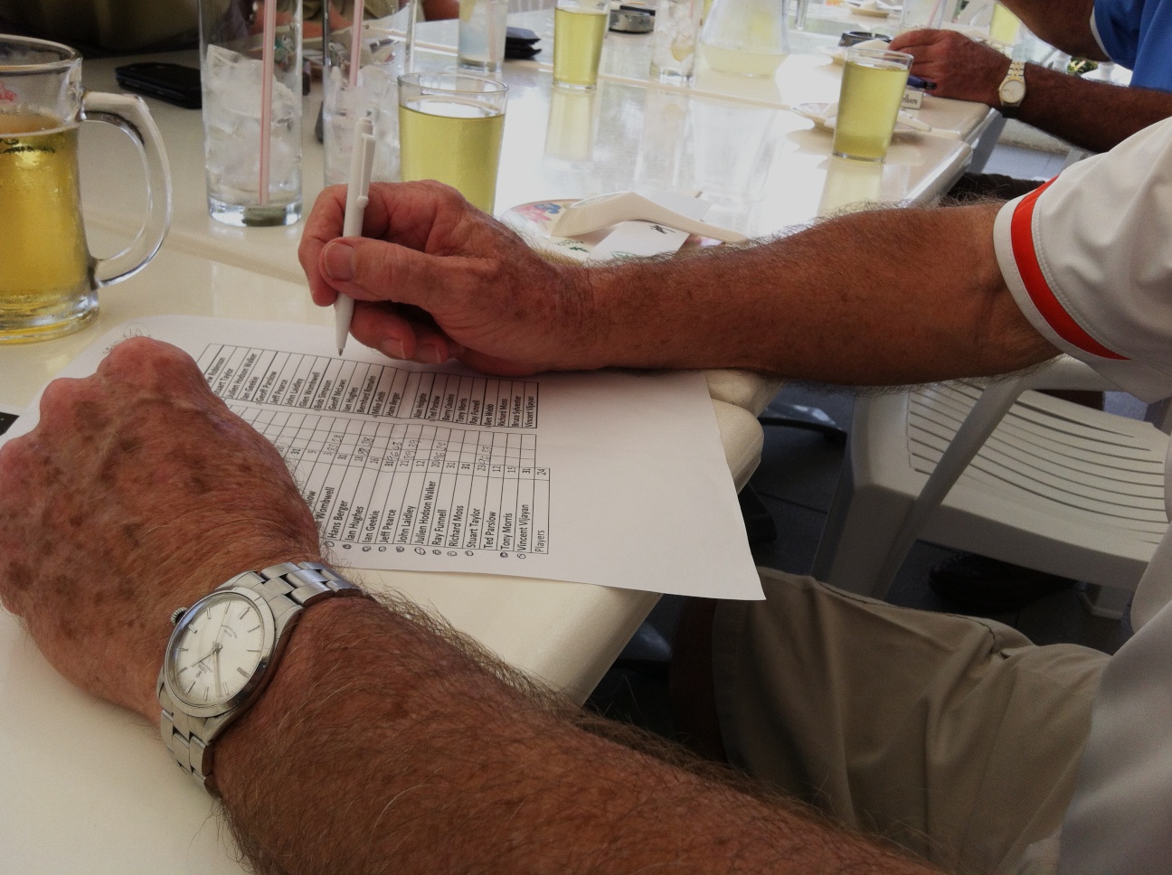 Rick Brown may be difficult to recognise when looking at his new fresh-faced look …. but you only need to check out his shorts to confirm that it’s Rick. Mike Smith as always … counting the money.