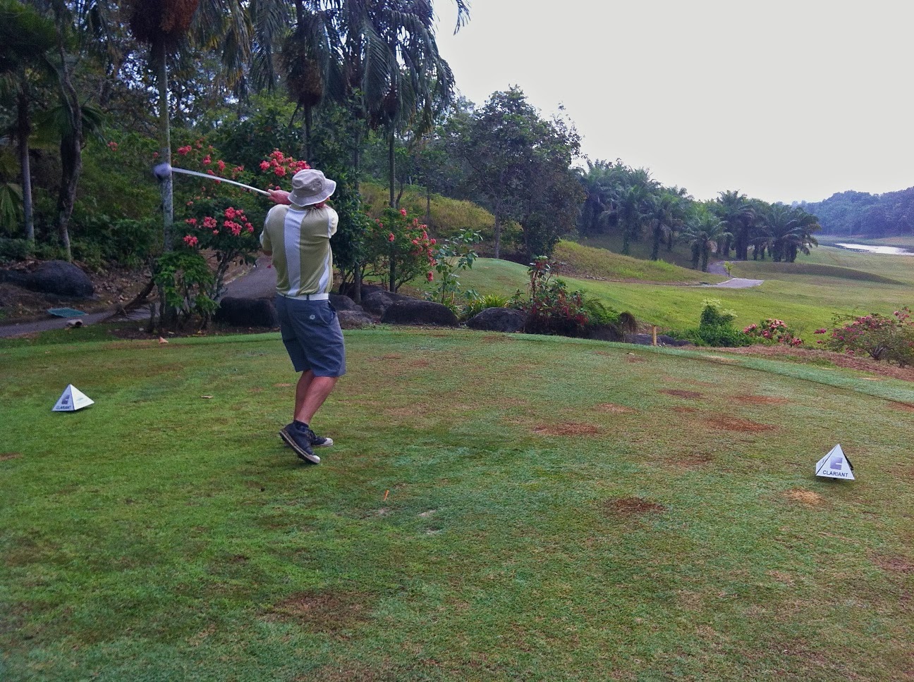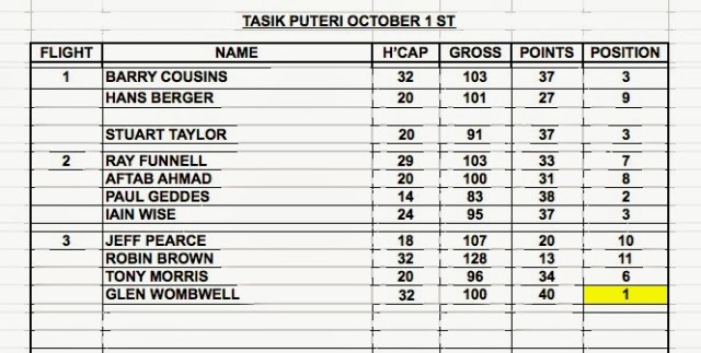 We teed off before 0740 hrs and the weather was good, light cloud. Tasik was in good condition, with lively, quick and in some cases bouncy greens. It was Iain’s birthday, so he kindly offered some NTPs, to celebrate the occasion. Ironically only 2 holes were achieved. Hans B on hole number 3 and Glen on hole 14. Iain then decided to present the other 2 sleeves to 5th and 7th places. Stuart got the 5th place as a result of being at the lunch.. and Ray got 7th place.