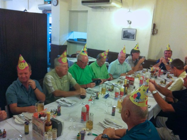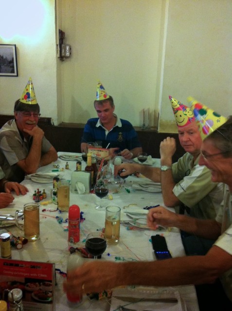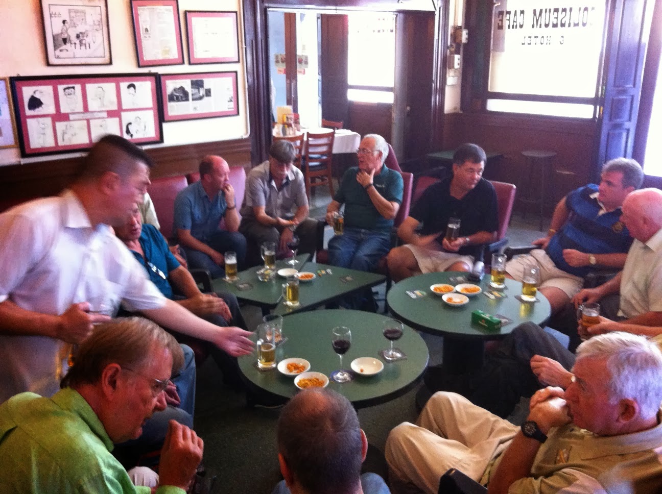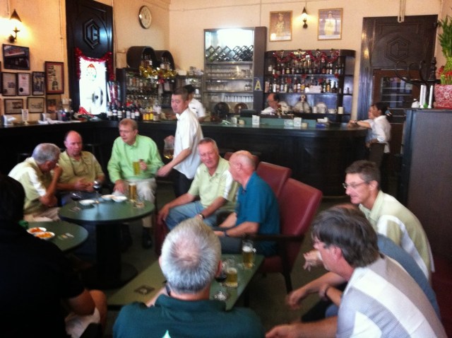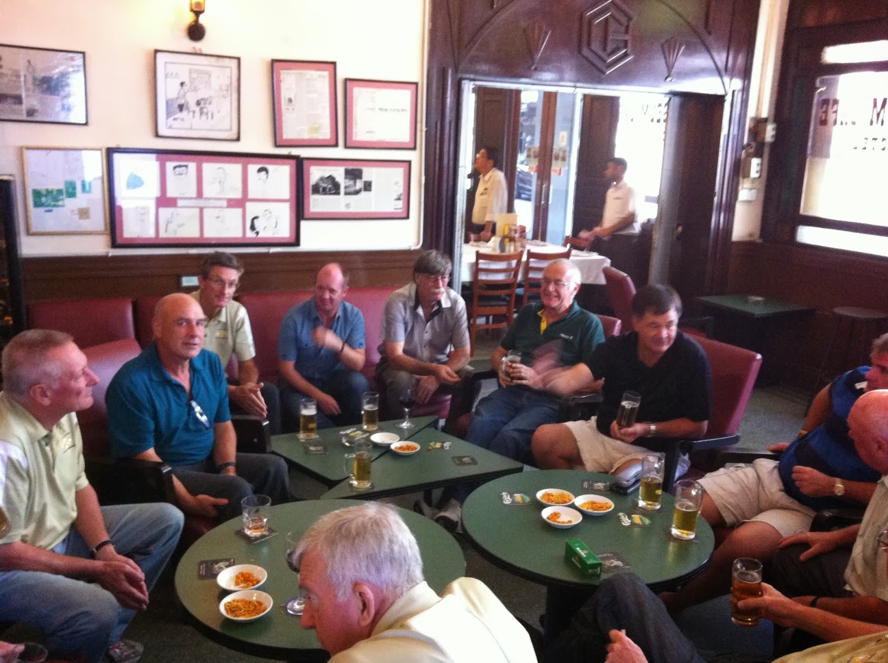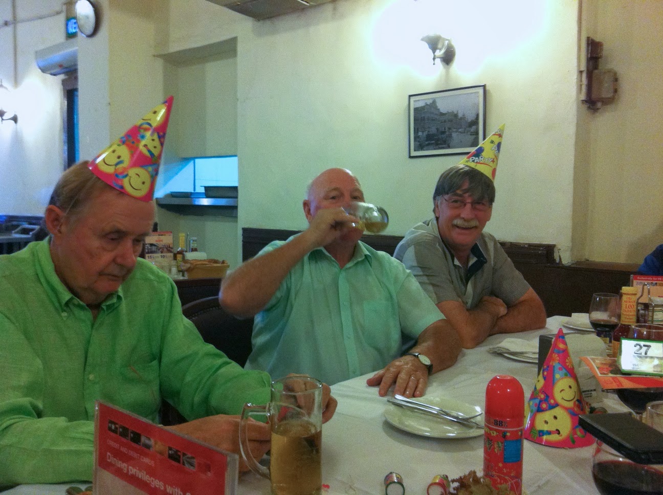 15 Loose Cannons turned up for the annual revelry at the Coliseum Cafe to celebrate Xmas. Pre-drinks in the Coliseum Bar were partaken, then we all quickly adjourned to the back dining room, tactfully placed behind some dark screens to continue the festivities. Lunch comprised prawn cocktail, “Desperate Dan” style steak pie with mash potatoes then apple pie and ice cream … all washed down with copious quantities of wine.