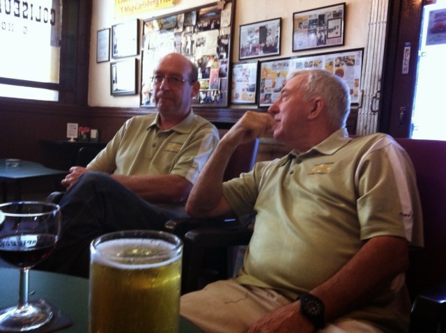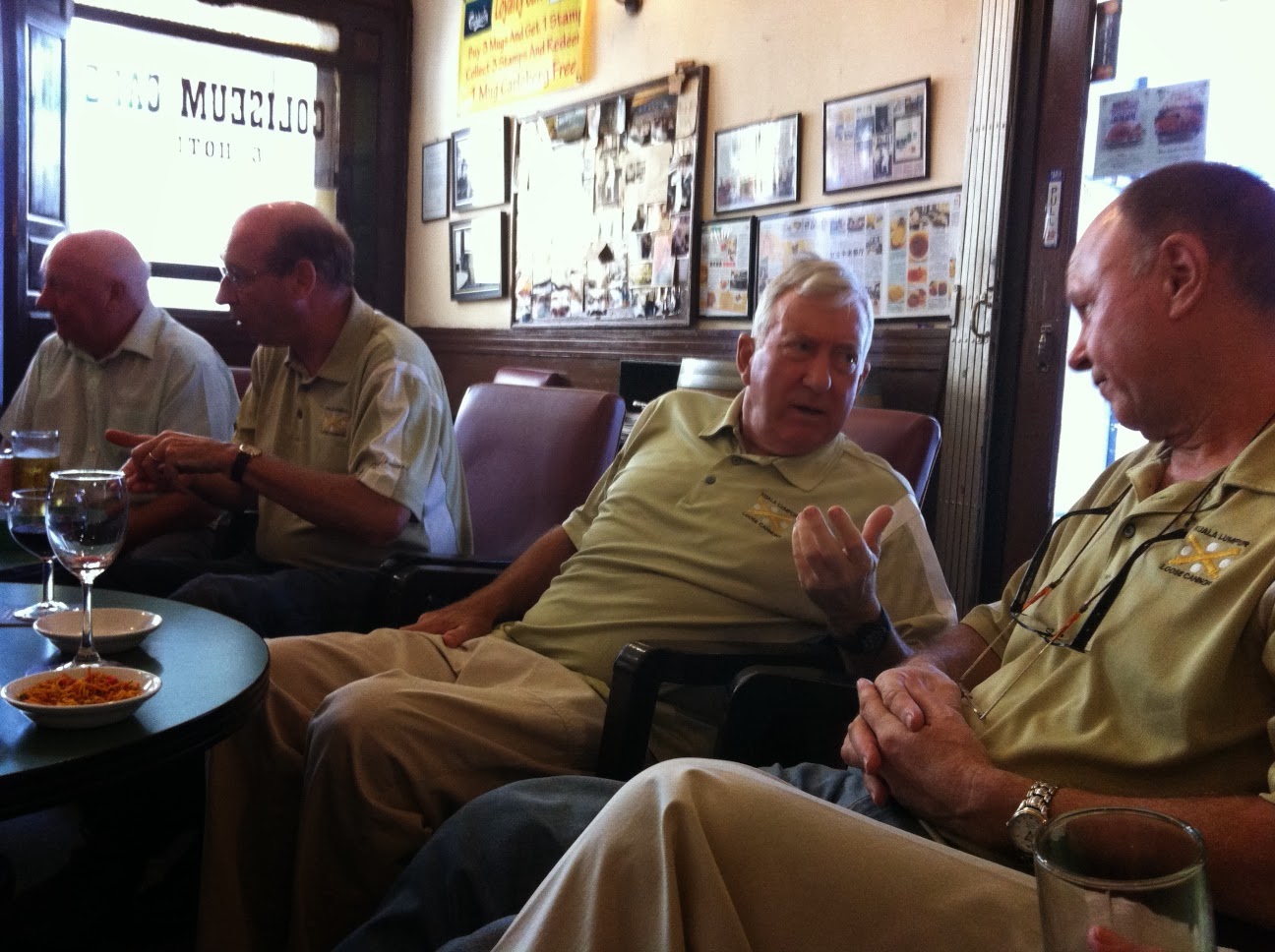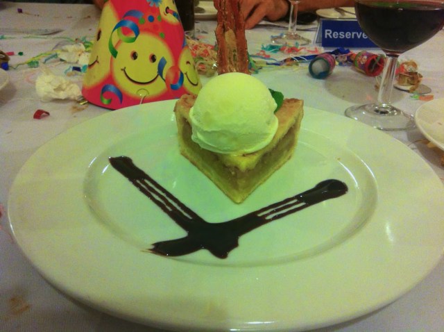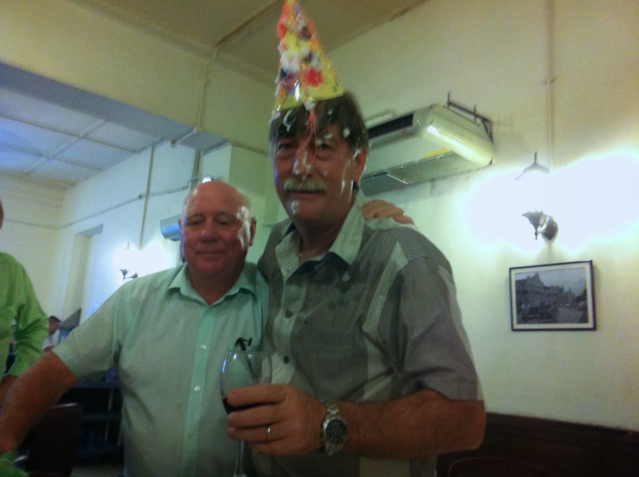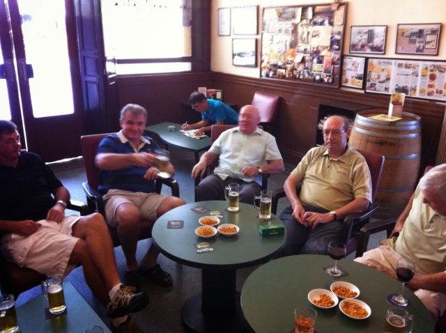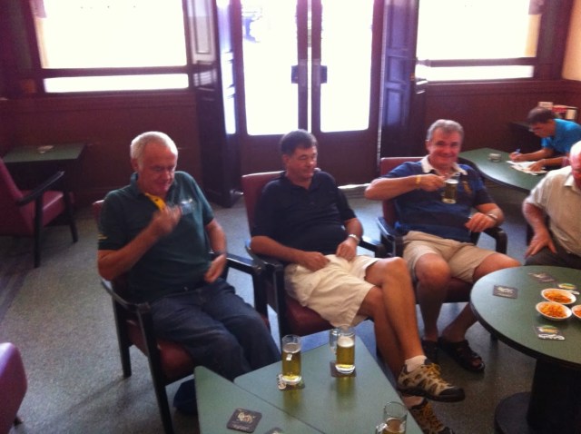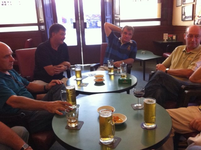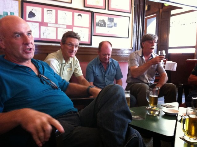 15 Loose Cannons turned up for the annual revelry at the Coliseum Cafe to celebrate Xmas. Pre-drinks in the Coliseum Bar were partaken, then we all quickly adjourned to the back dining room, tactfully placed behind some dark screens to continue the festivities. Lunch comprised prawn cocktail, “Desperate Dan” style steak pie with mash potatoes then apple pie and ice cream … all washed down with copious quantities of wine.