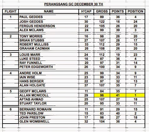 The Trophy game will be played on MONDAY December 30th at Perangsang GC. A good way to finish off the year, with lunch at Tangs on the way back. Please be at the club by 0720 hrs with tee off at 0745 hrs. 2 tee boxes have been booked. Flights 1,2,3 off tee box 1, Flights 4,5,6 off 10. Costs 100 RM for seniors, 120 RM for others. Members, Hole in One Card 80 RM. 1 Caddy booked per flight. Additional caddies at 50 RM.