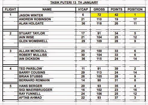 Next week we are playing at Tasik Puteri on MONDAY 13th. 5 Flights and 2 tee boxes booked. Please be at the club by 0720 hrs for a tee off at 0745 hrs. Costs will be 100 RM for Seniors and TP book holders, 130 RM for the others. Caddies will be at own expense 50 RM.
