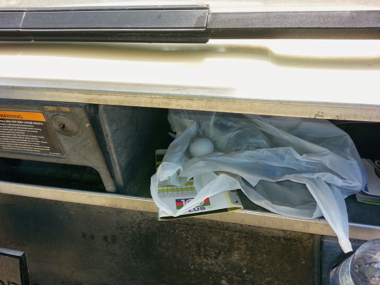 Henning Therkelsen managed a trick shot today managing to hit his ball into his partners’ buggy, lodging in the front tray …. see photograph below.