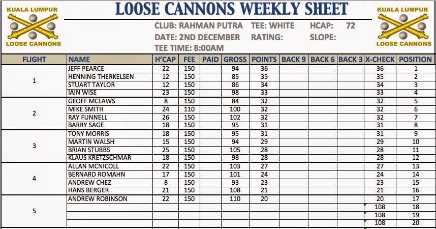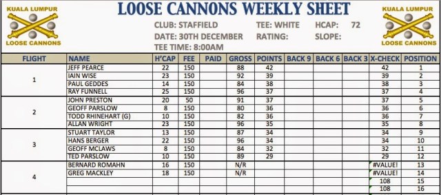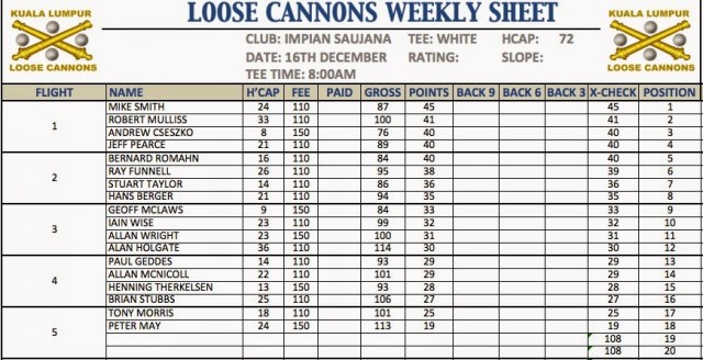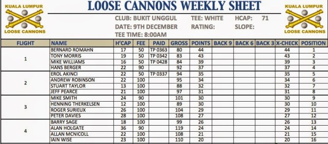 It was interesting to note that of the top 5 best scores today …. 4 of these were from the players who were members of Bukit Unggul …. obviously local knowledge counts for a lot here. We had 4 players score better than their handicap. The winner with an excellent gross 80 and 44 points was Bernard Romahn with Tony Morris runner up with 43 points and a gross score of 83. Full results below.