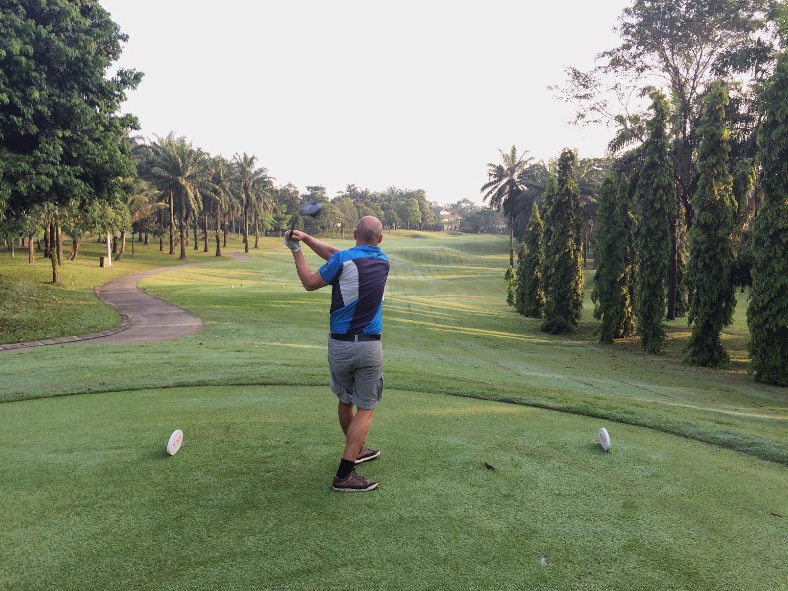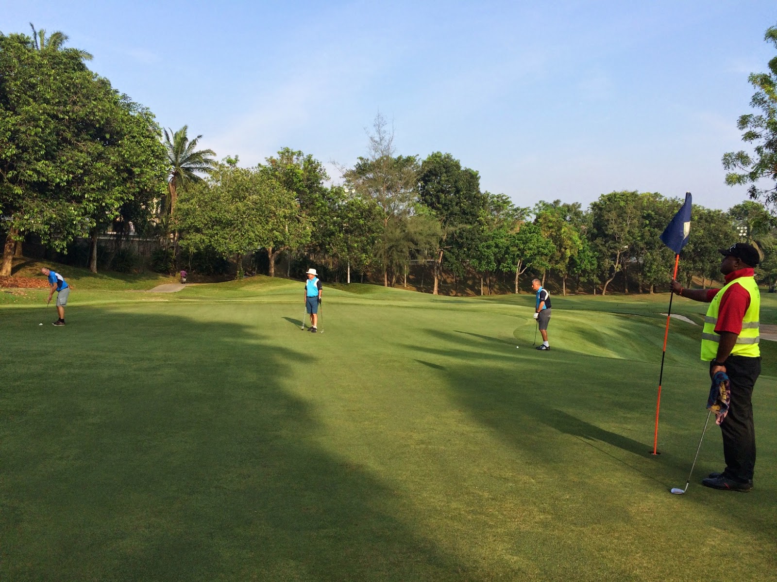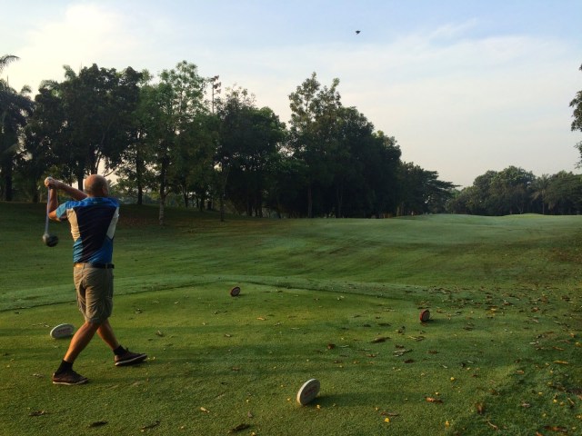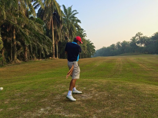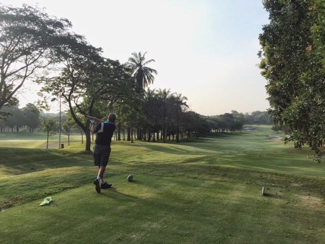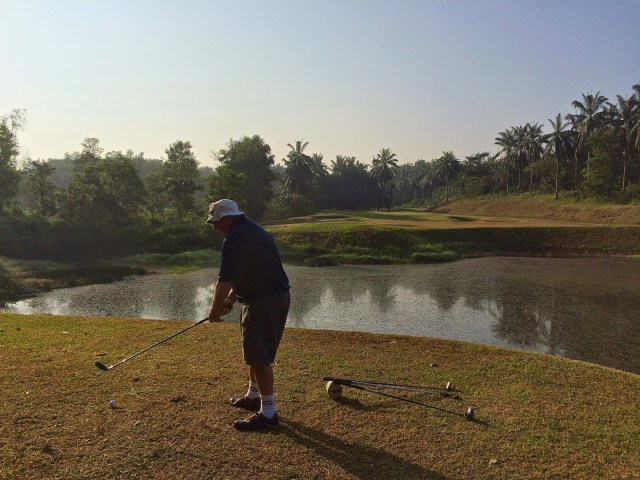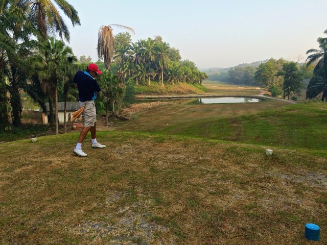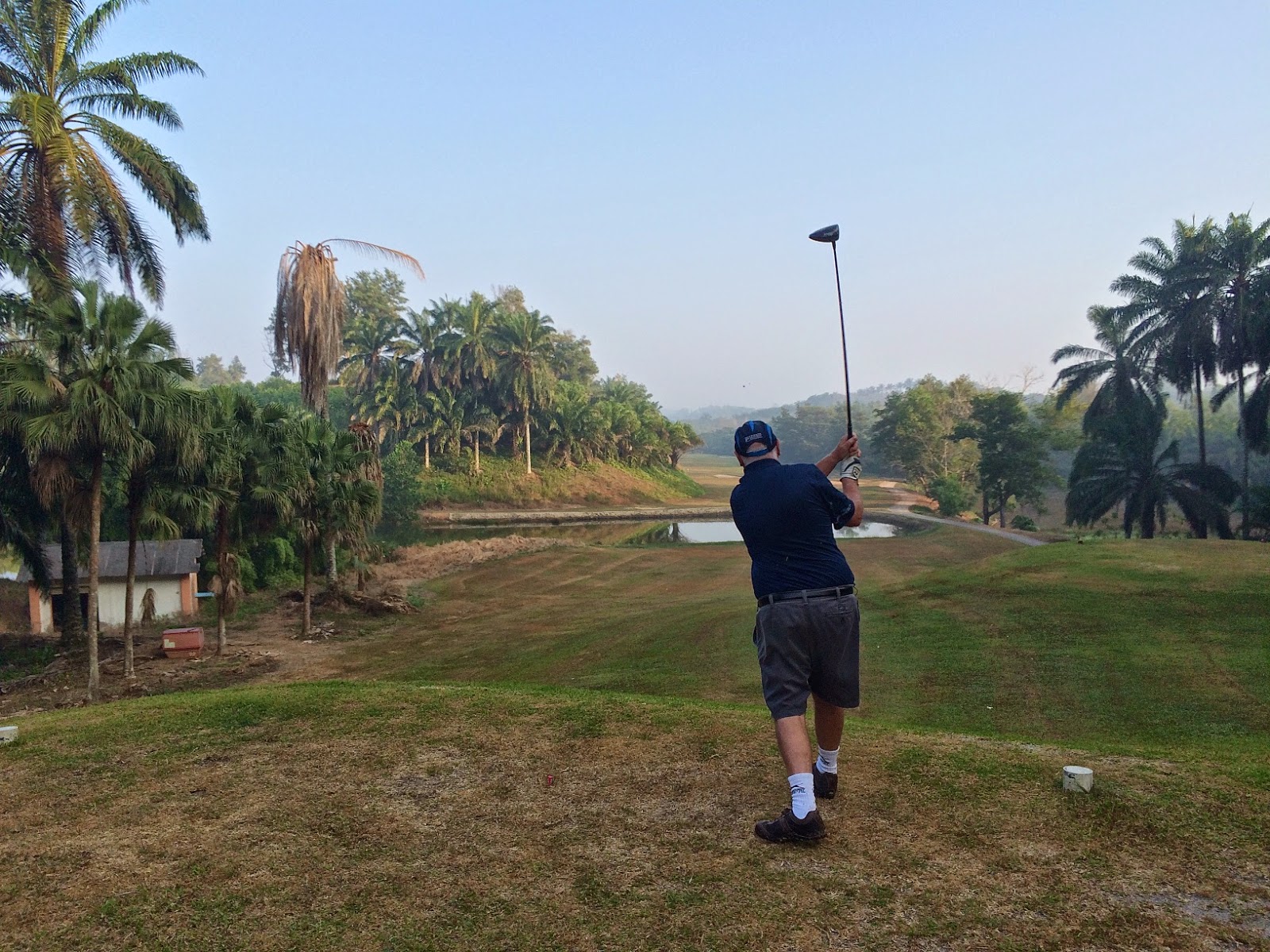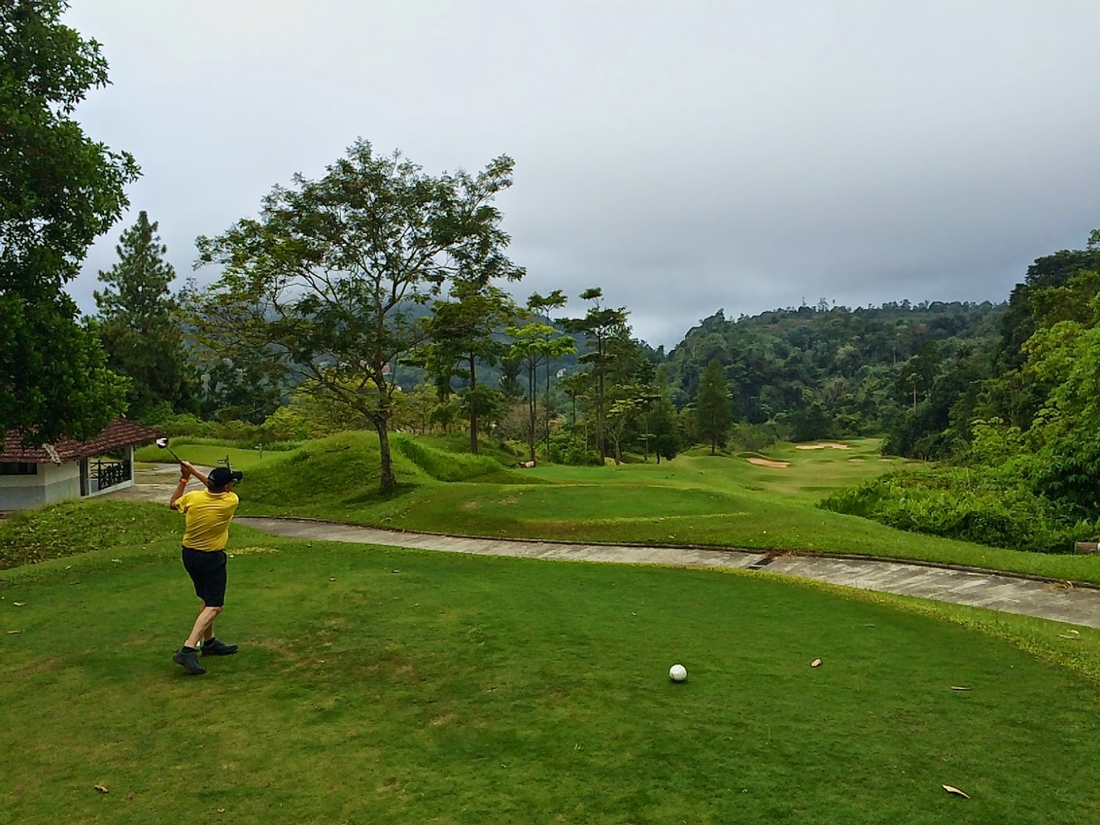 We all got off on 2 separate tee boxes at just before 8:00am and the first 9 holes were relatively cool, but got progressively hotter as the morning went on. The course was badly cut up by wild boars and the green surrounds were in pretty bad shape as were the bunkers. You really had to keep on the fairway as there was no relief by slicing or drawing onto other fairways – each hole was individually carved through the palm oil plantations so once of the fairway your ball was well and truly gone.