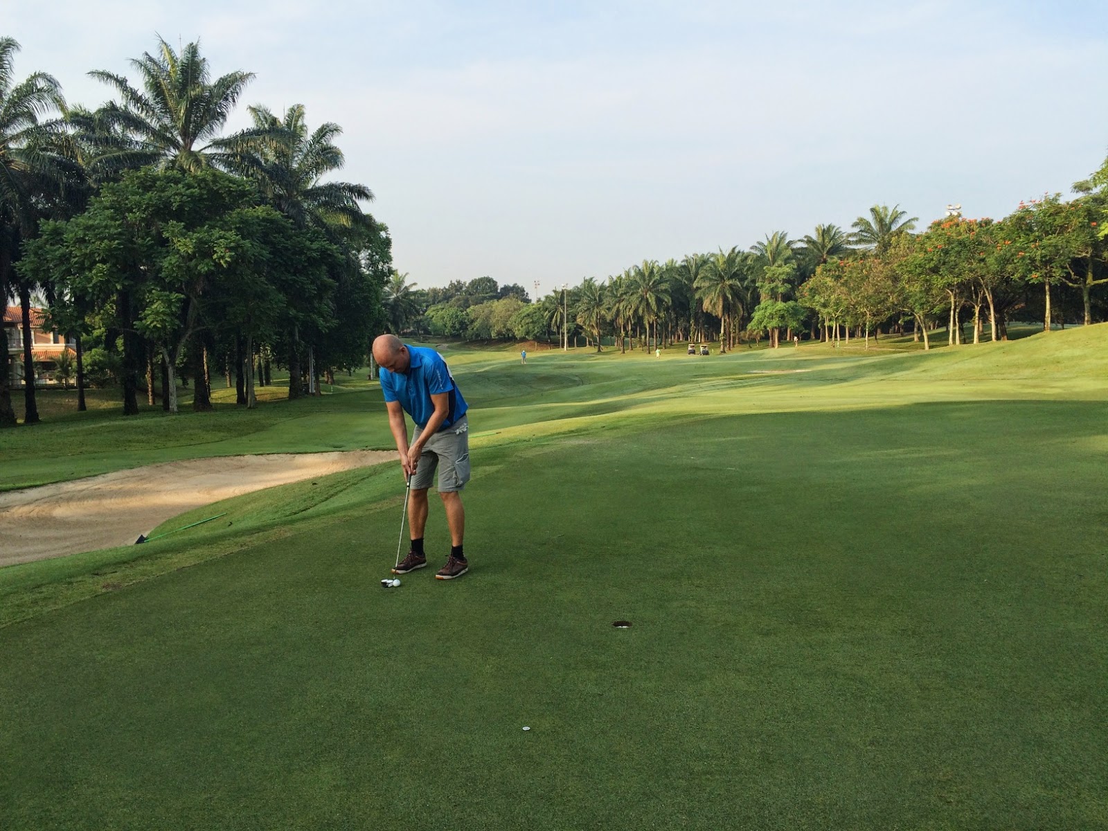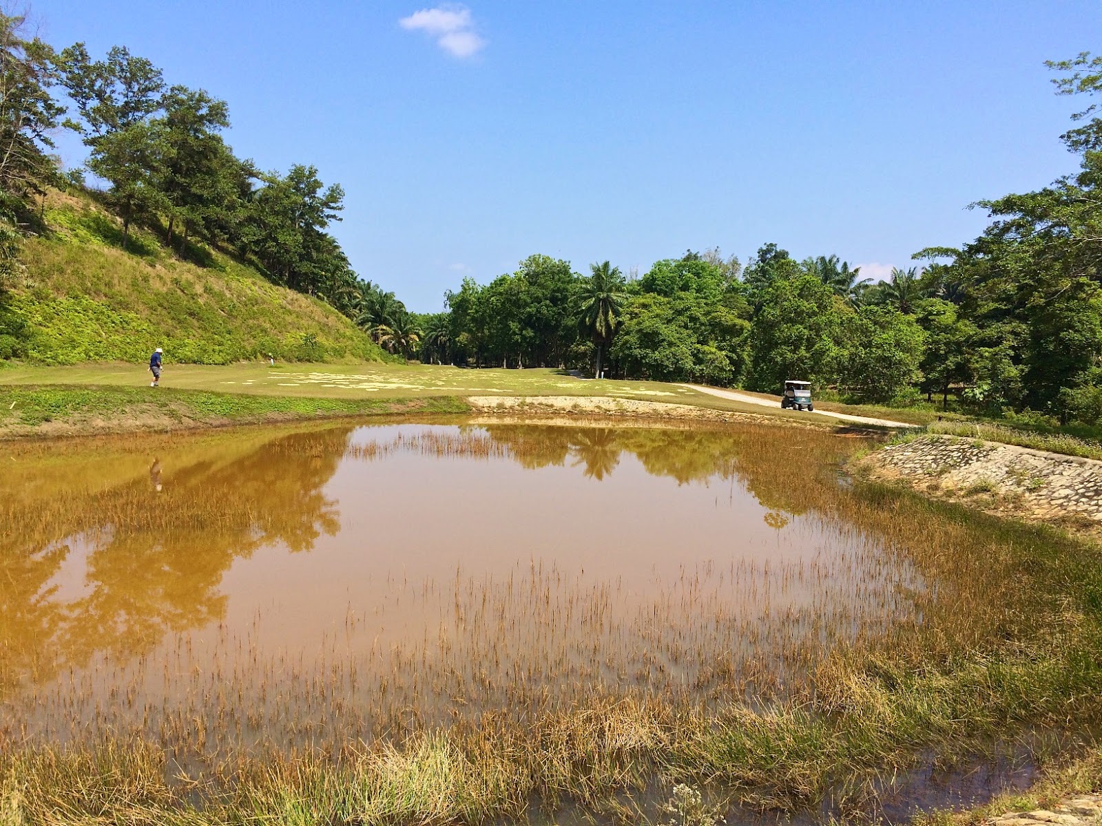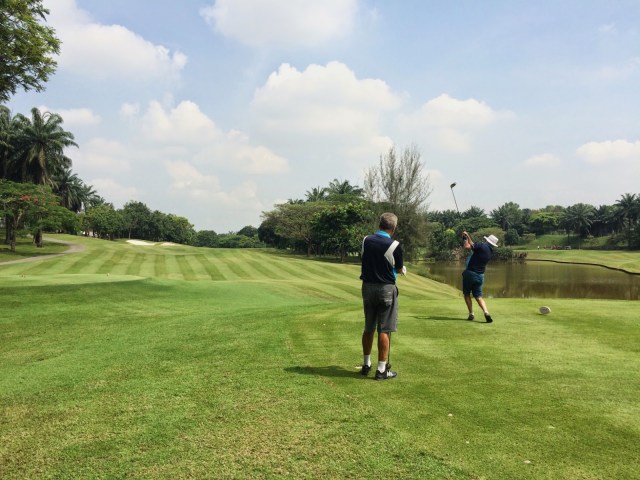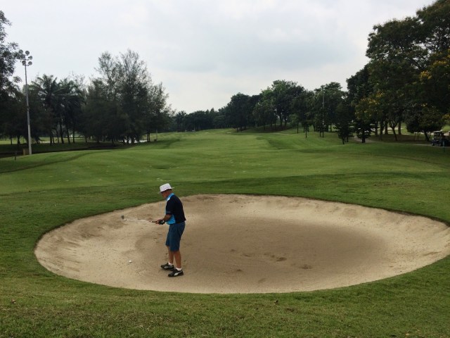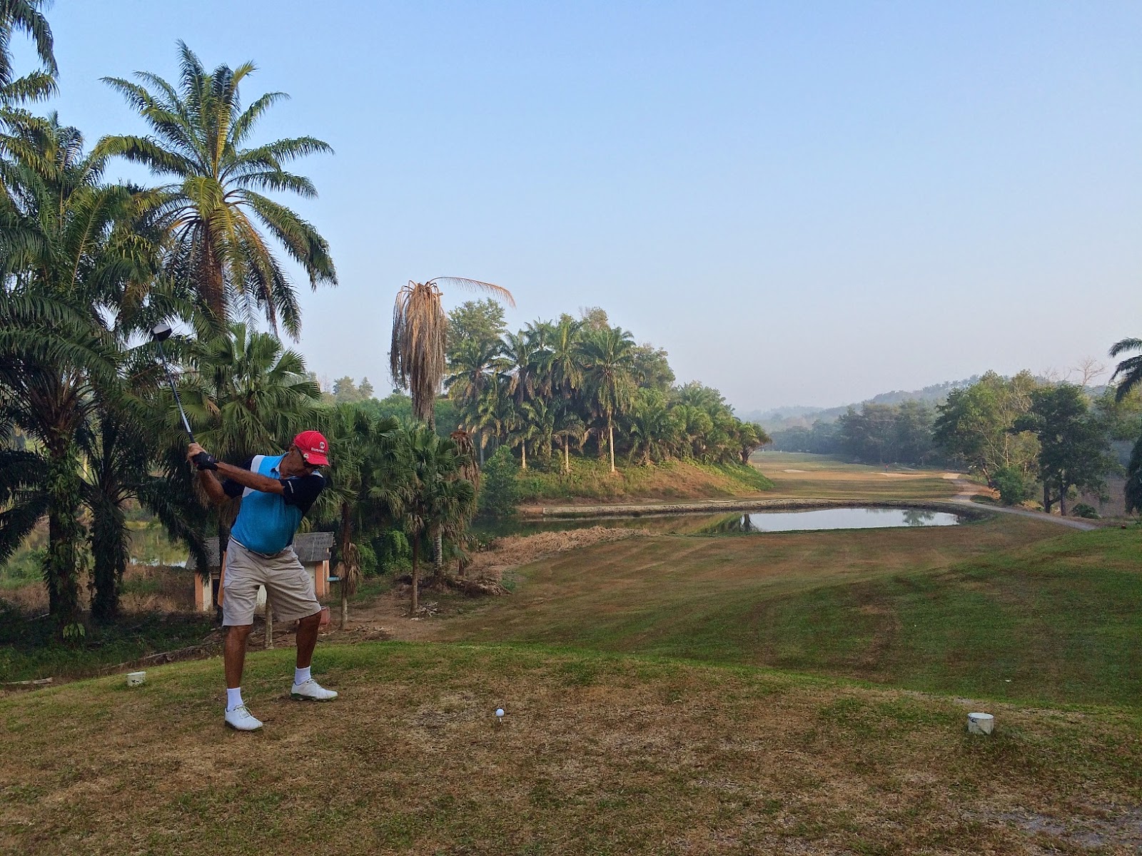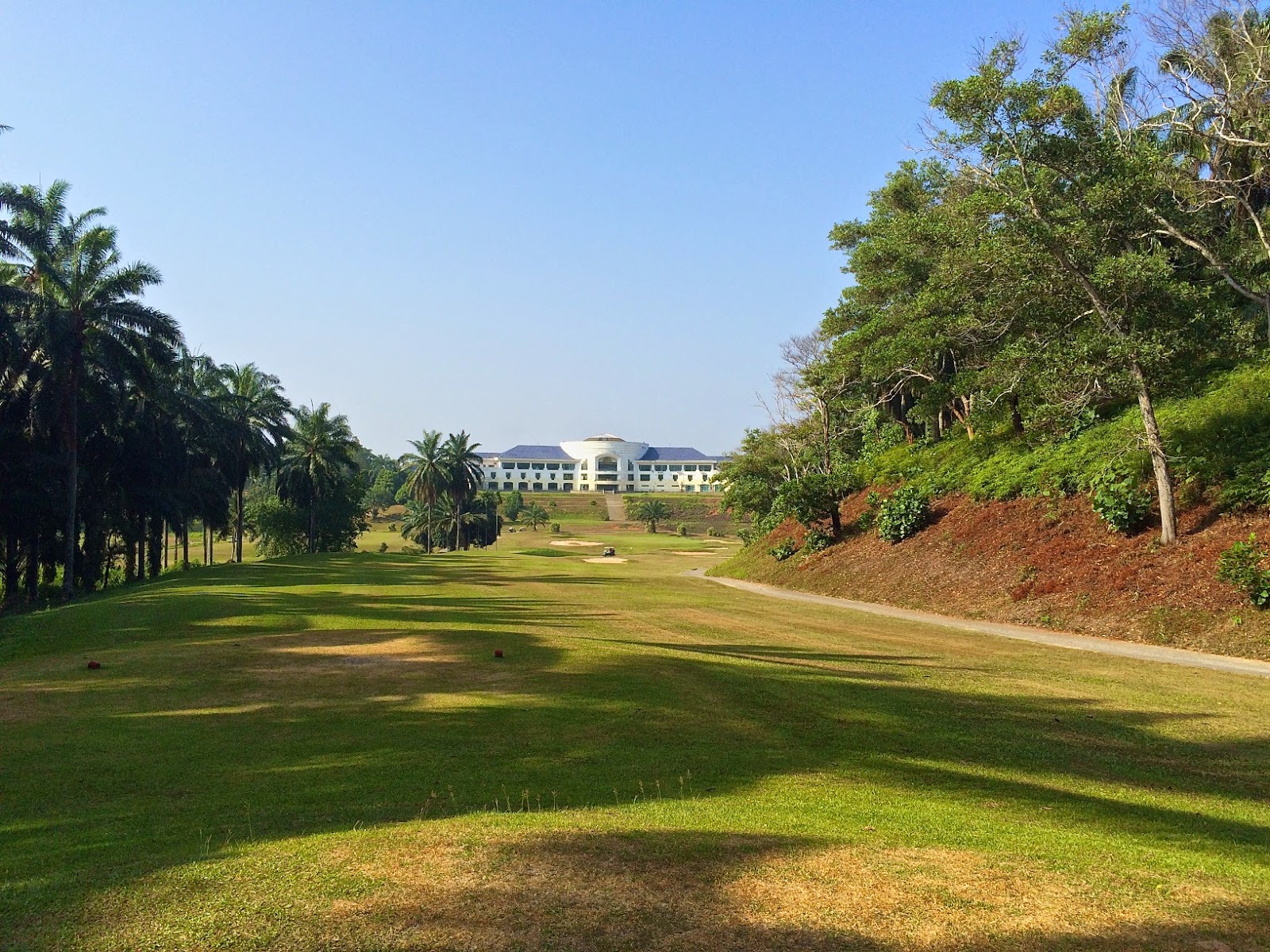 We all got off on 2 separate tee boxes at just before 8:00am and the first 9 holes were relatively cool, but got progressively hotter as the morning went on. The course was badly cut up by wild boars and the green surrounds were in pretty bad shape as were the bunkers. You really had to keep on the fairway as there was no relief by slicing or drawing onto other fairways – each hole was individually carved through the palm oil plantations so once of the fairway your ball was well and truly gone.
