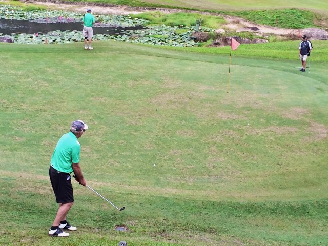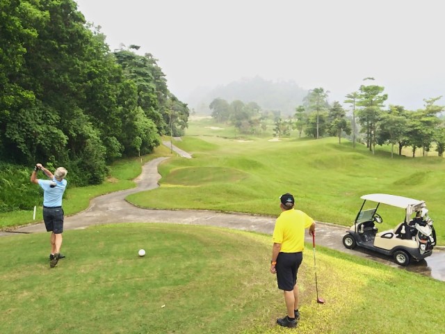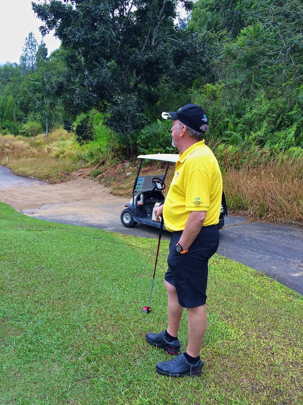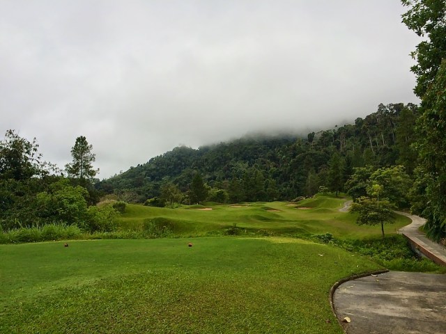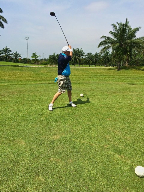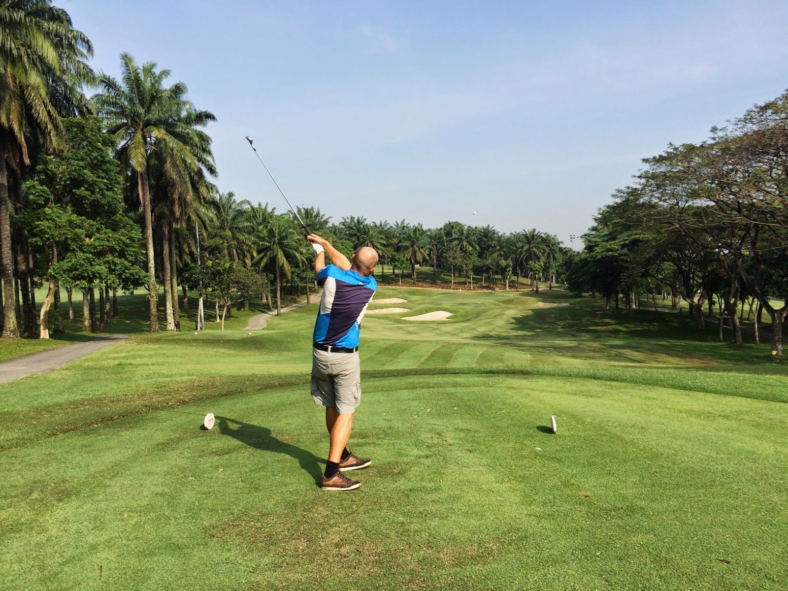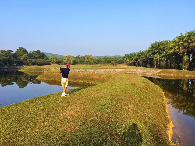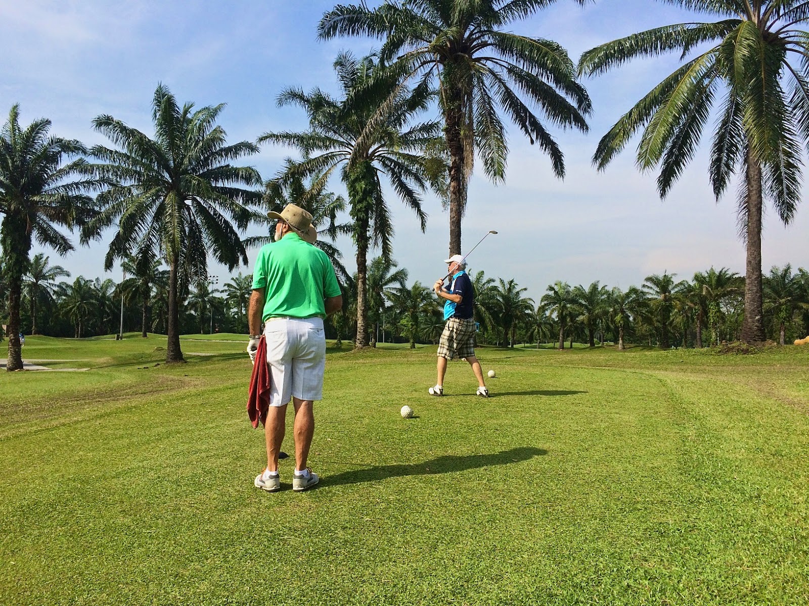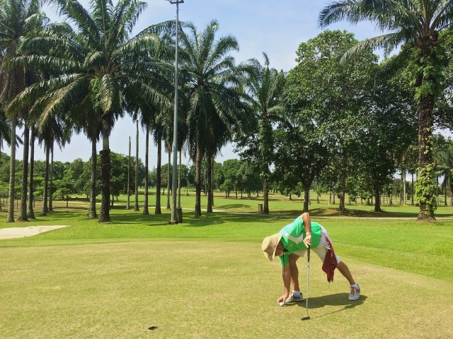 We all got off on 2 separate tee boxes at just before 8:00am and the first 9 holes were relatively cool, but got progressively hotter as the morning went on. The course was badly cut up by wild boars and the green surrounds were in pretty bad shape as were the bunkers. You really had to keep on the fairway as there was no relief by slicing or drawing onto other fairways – each hole was individually carved through the palm oil plantations so once of the fairway your ball was well and truly gone.