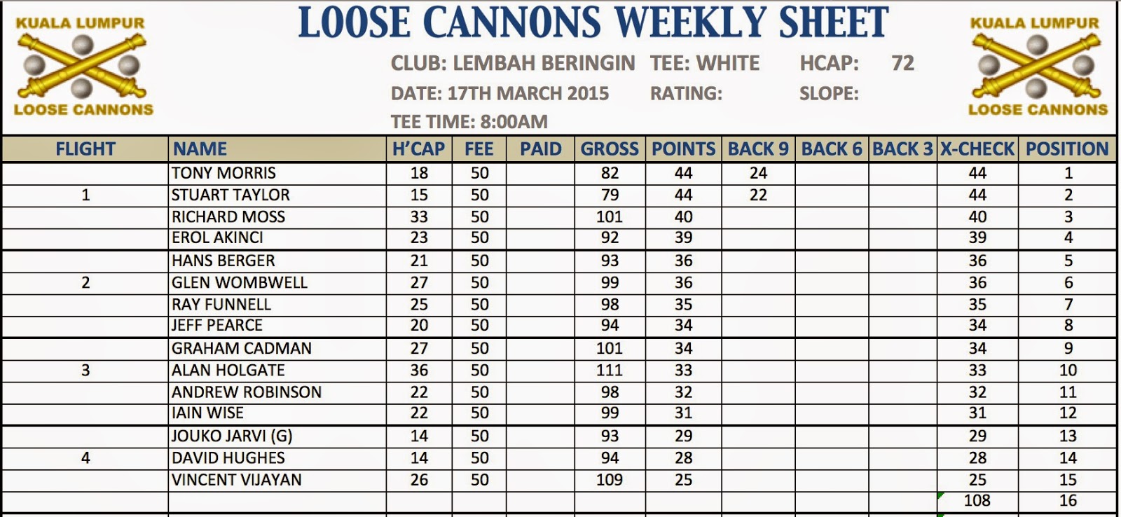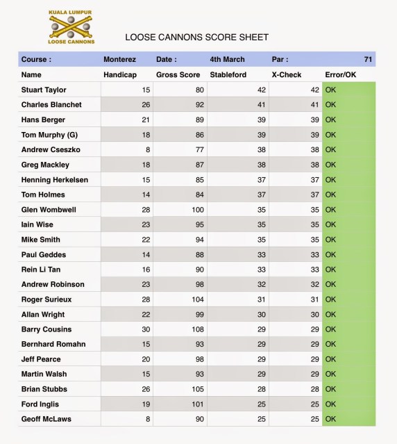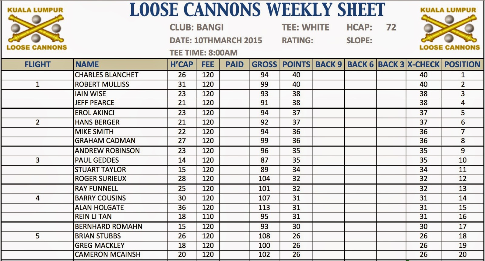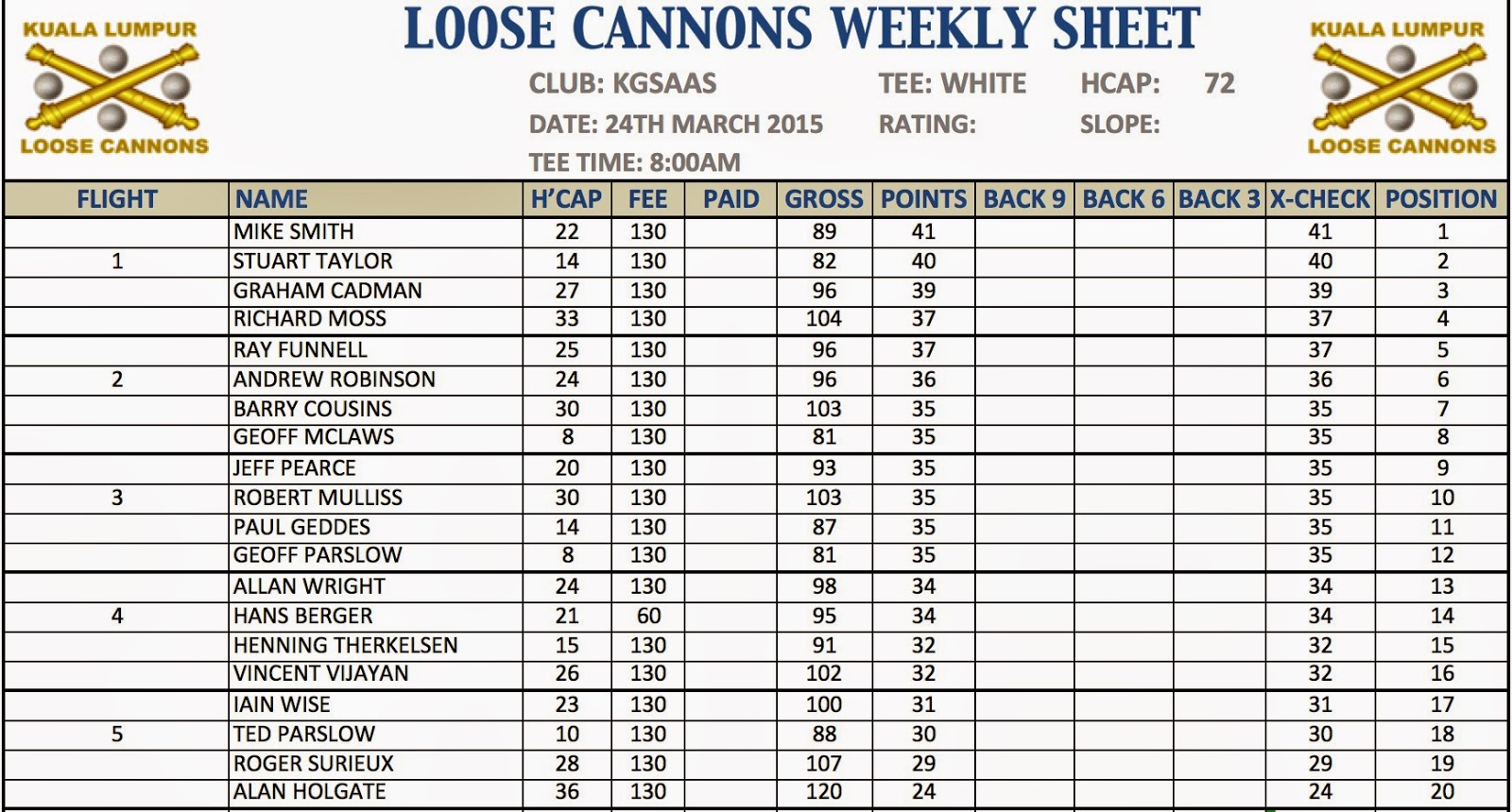 A good turnout today with 5 full flights and 20 players. Conditions were good with clear and relatively cool weather. The course was very good and the greens, although slow on the 1st 9 holes, were in great condition. We set out from 2 tee boxes and got finished by 12:30pm. 19 of us out of the 20 (surely a record, and including a surprise attendance by Ray Funnell) had lunch at the Chinese restaurant which was enjoyed by all. Although a bit on the expensive side (mainly due them charging us for small bottles of Tiger beer to fill the jugs …. 48 in total at RM13 a pop!) the Loose Cannons kitty kindly chipped in to offset this and subsequently only cost the punters RM50 a head.