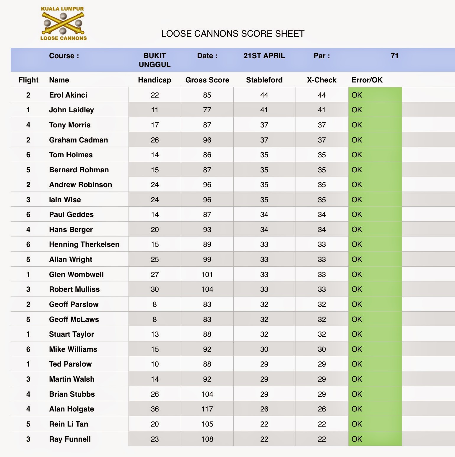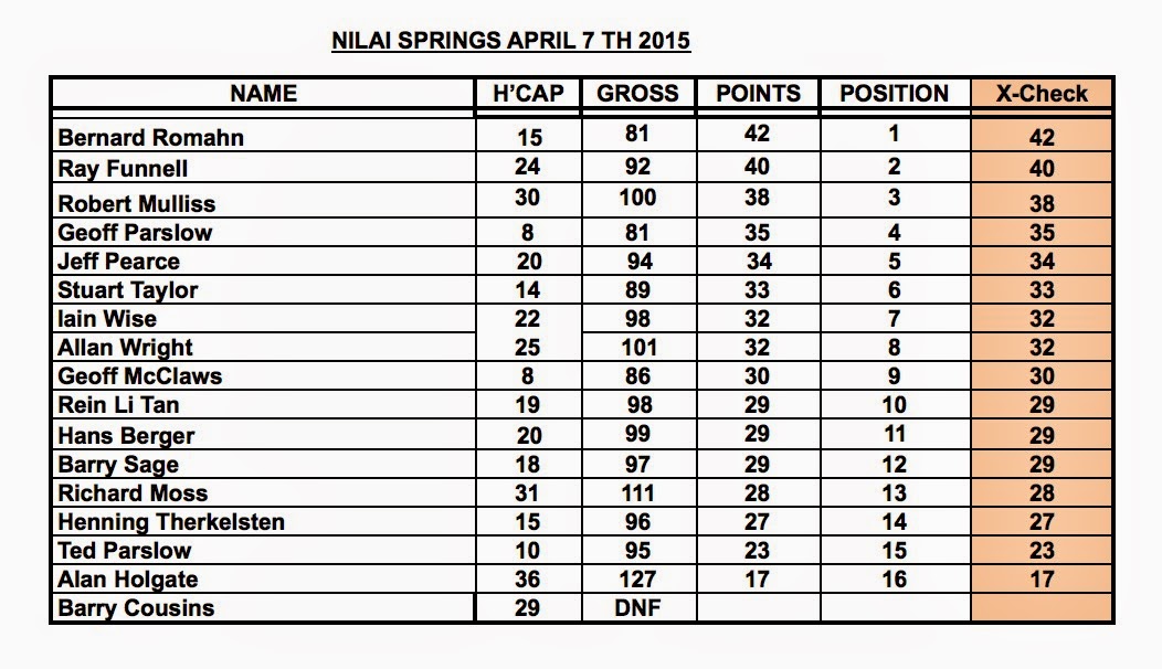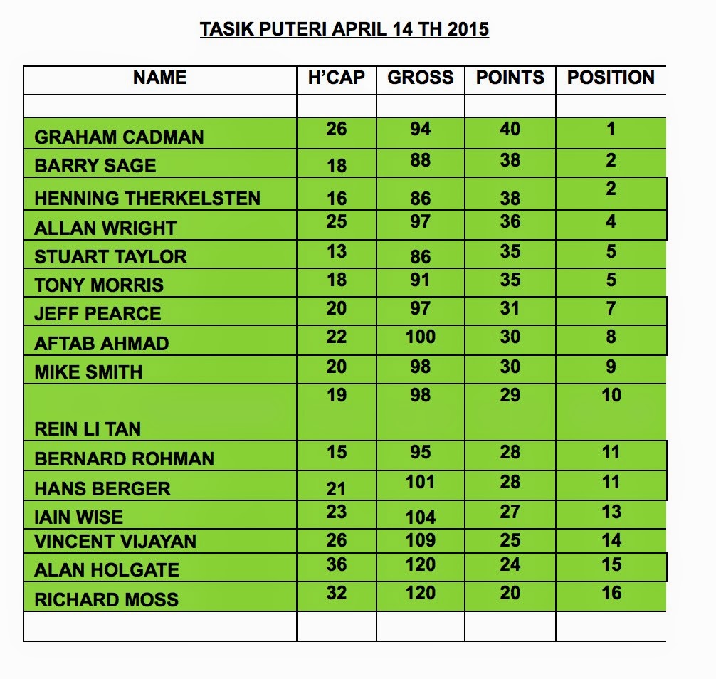 The clear winner today was the Birthday Boy, Hans Berger, with 40 points and a gross of 88. Hans was duly presented with the April Trophy plus the RM50 prize. There were 4 runner ups all at 37 points ( Henning, Aftab, Andrew & Paul) – no count back was done. Best gross of the day was Jason Winter with a 79. Full results tabulated below :