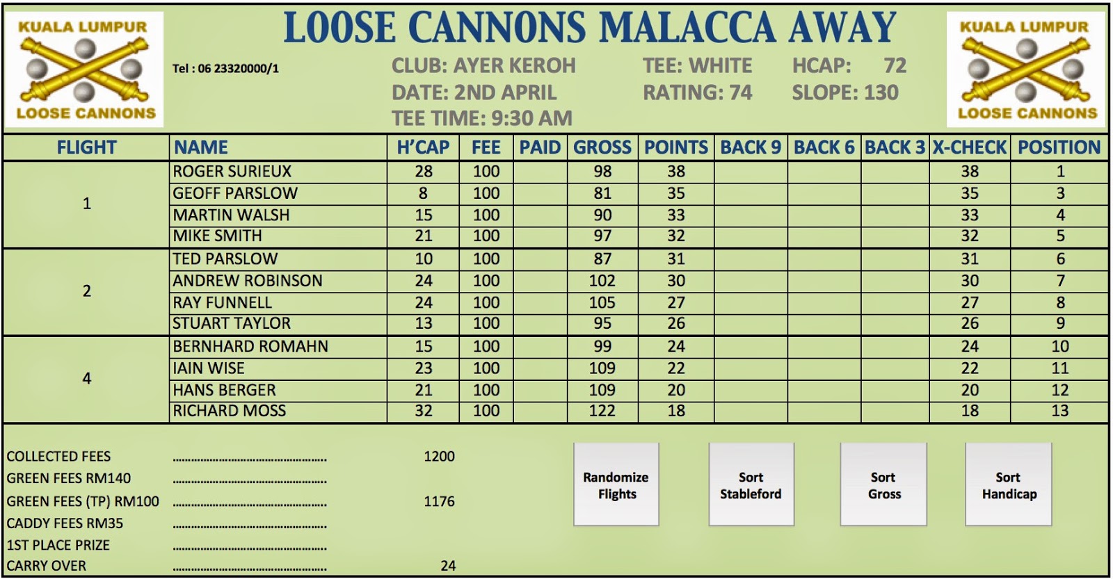 All in all an excellent tour and hopefully enjoyed by all participants. Many thanks to all the players who came down to Malacca for the 3 days and tho the additional 4 players who came down on the first day for the monthly trophy game.