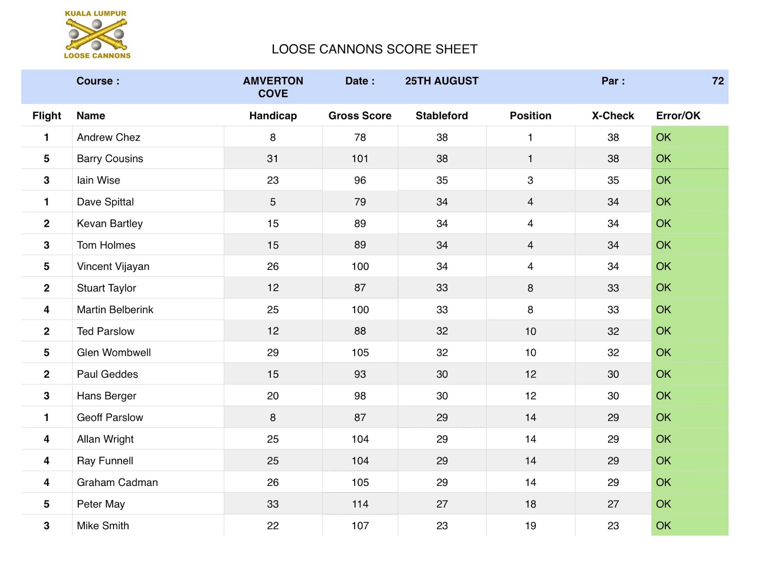 We had 5 flights today and 19 players for the Loose Cannons August Trophy Game at Amverton Cove. We all got off on two tee boxes at 8:00am and all made good time around the course. Weather was good – a little overcast and hazy. The course was generally in good condition but I noticed a few areas around the course which were rather untidy and needed some attention. Greens were fairly good but many people noticed them to be a little bumpy.