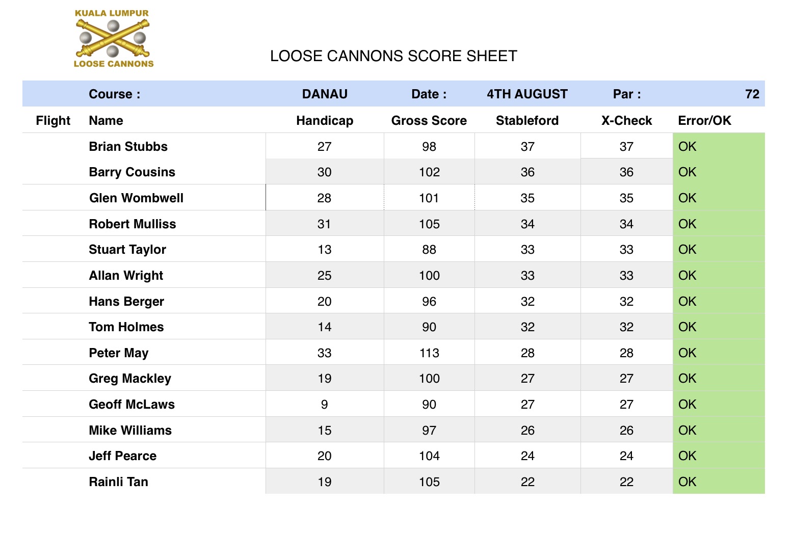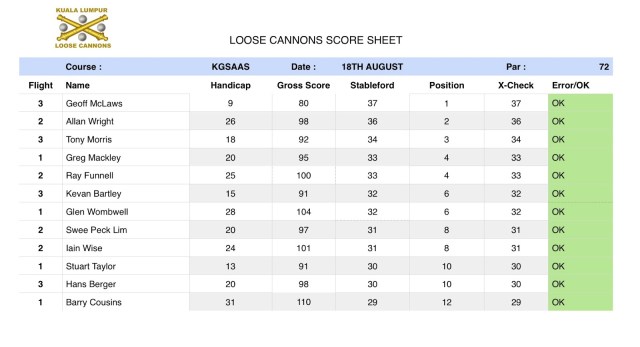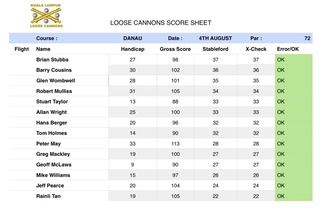 KGSAAS was in good shape as 3 full flights tee’d off on the President 9 at 8:00am. Greens were very good but a little slow. It was a lovely morning but it started to get very hot and humid by the back 9. We all had lunch at the club following the game and struggled as usual with the very poor service to get our food and drinks – far better up the stairs at the Chinese restaurant.