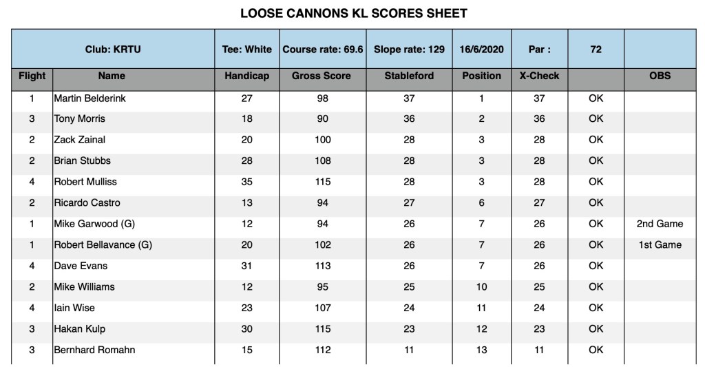 Our first tour towards Rawang after the lock down and it turned out well. 15 players gathered for some golf at Tasik. Another smooth take off (it’s gonna be boring without any hiccups) well before t-time and start from 2 t-boxes meaning that we all got back well before midday. The course was in a very good nik and so were most players. 10 out of 15 played their handicap or better. We don’t see that happening very often.
