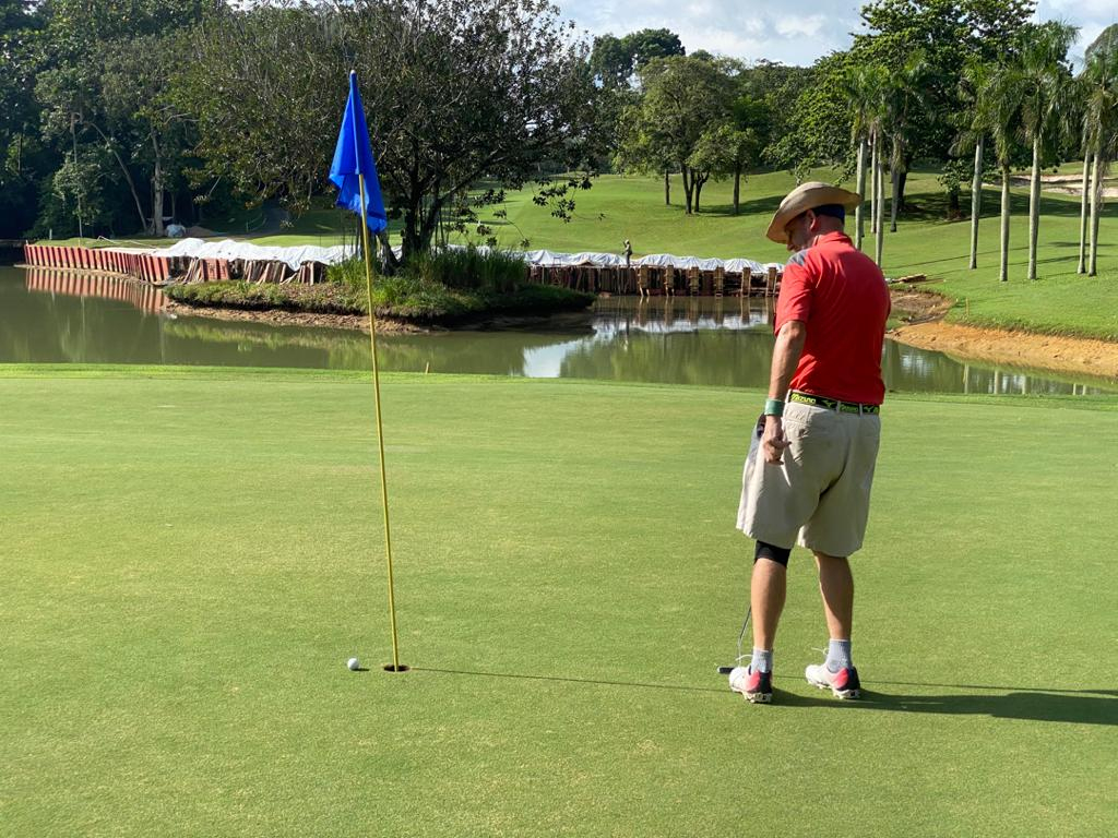 On the 18th hole at the conclusion of his 500th game Andrew confidently sinks a great putt to finish.