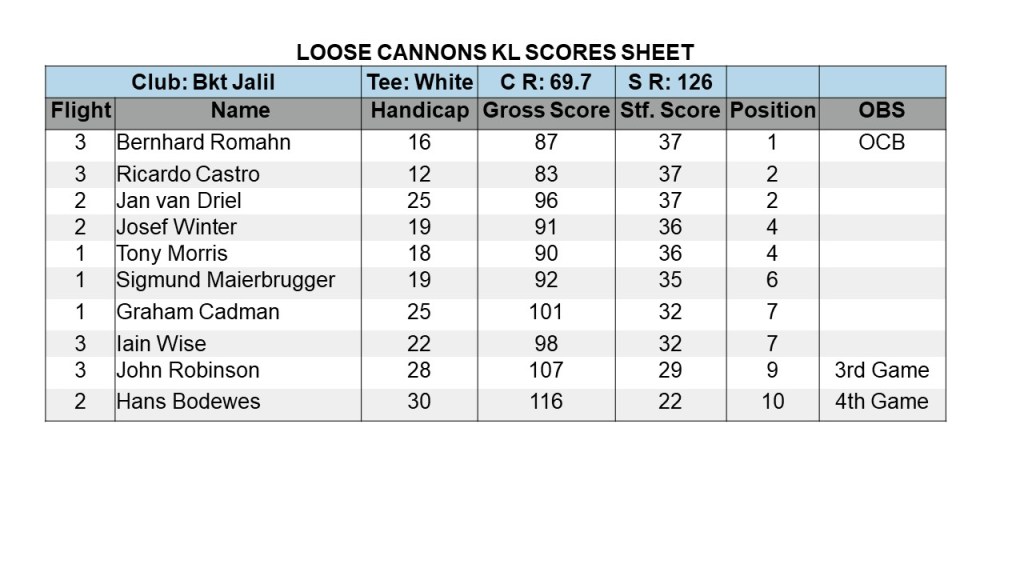 My last day in the office was welcomed by 16 players! On top of that all 16 stayed for lunch as well……….unprecedented. But that’s the LC way; play and lunch. Most of us were early except for Hans Berger who was on the way to Slim River and Reinli who was stuck in his last pint of Guinness. Bukit Beruntung is an interesting and value for money course. The greens are really nice, just very slow. We took off by 8:00 am with flight 4 welcoming the 2 ‘missing in action’ a while later. Despite a little drizzle most of us had an enjoyable round of golf finishing around midday, well in time to make it for lunch in Full Moon restaurant. Today’s winner Siggy came home with a monster score of 85/42 collecting several prices (one last ‘C’ for you Mike W.). He got the RM 50 plus the ‘Golden Nut’ that he donated himself as a prize for the LC’s. We also found out how we can distract Siggy when he is playing well………… The rumors will be spread, just wait! Graham Cadman in second (93/40), long battling with Siggy (same flight) for the 1st place, but then the pressure became too much on the last 2 holes. A sleeve of balls for his battle with der Kaiser. A special thanks to Tony, who came in 3rd (87/39), for helping us to get some discount due to his membership. So a free ride for him today.