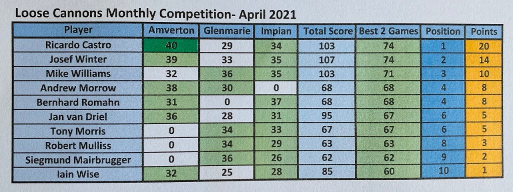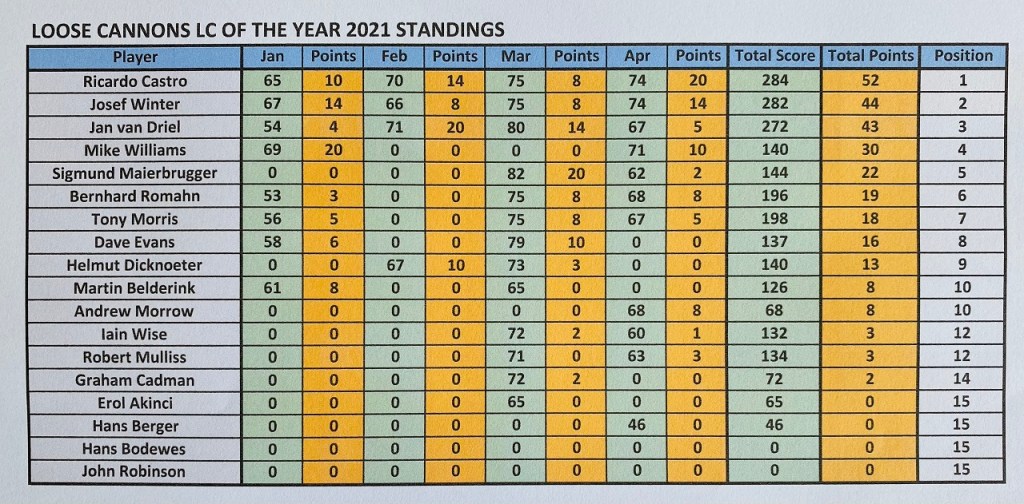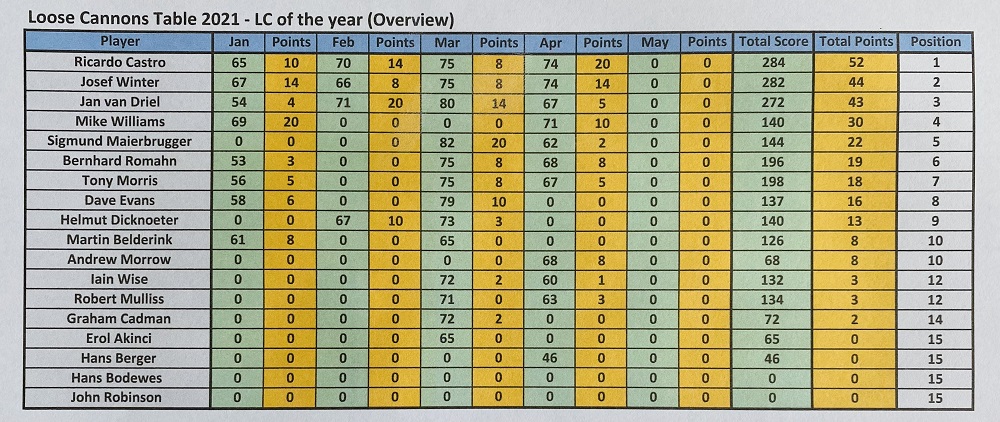 On the Loose Cannons, we have only played one game in May, so no monthly results. Maybe June, but that is questionable under the present circumstances. We still have a credit open at Bukit Jalil and Rahman Putra, so those would be the first ones to choose from when the courses will open again. Below LCOTY standings after May.