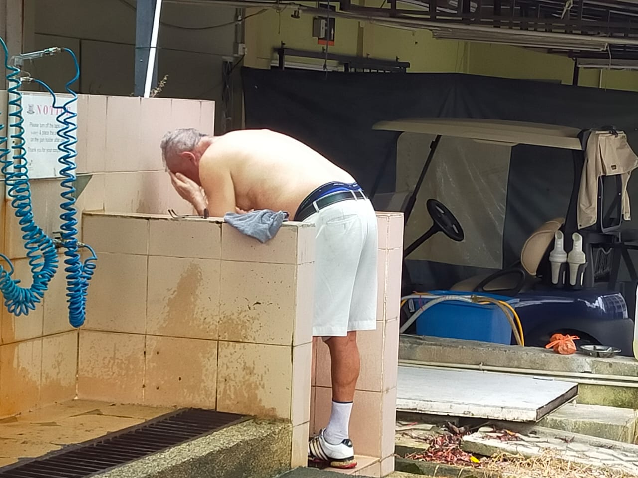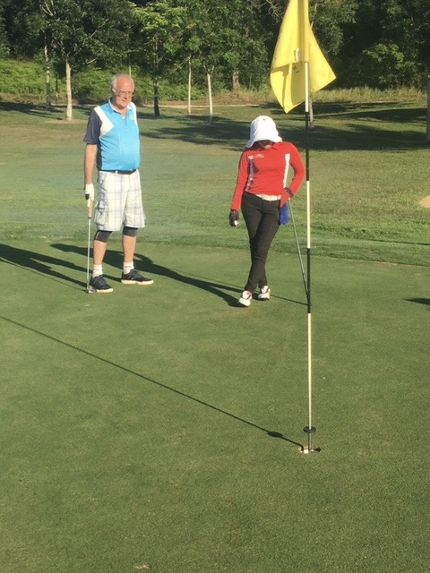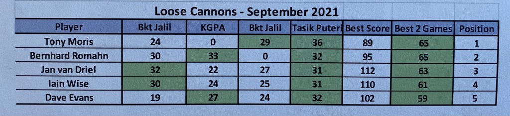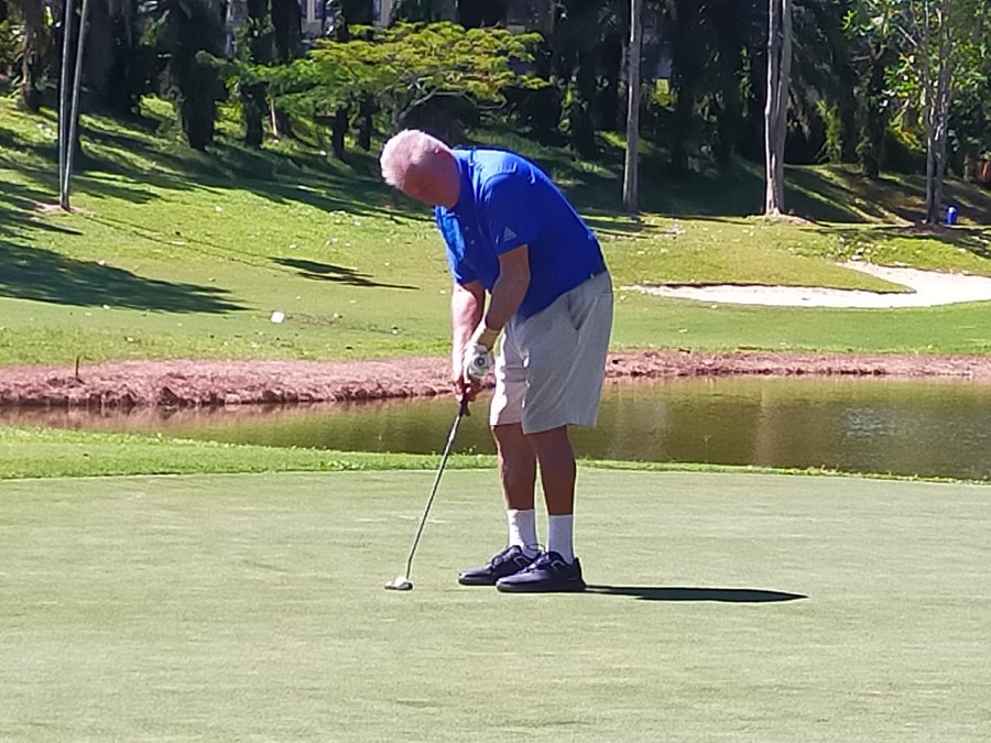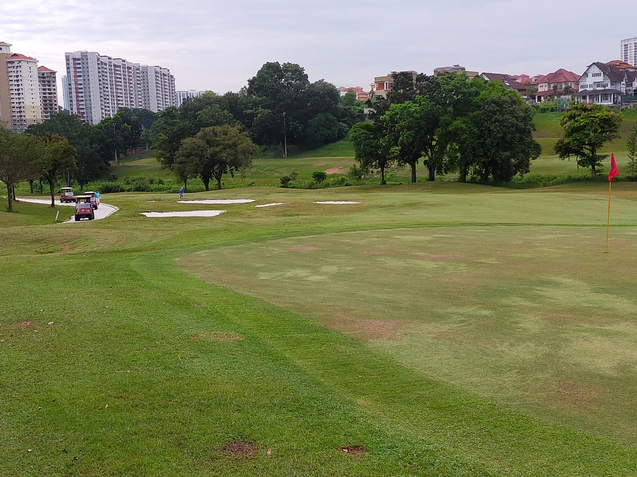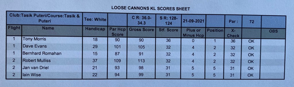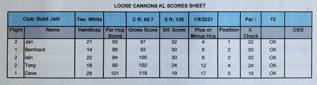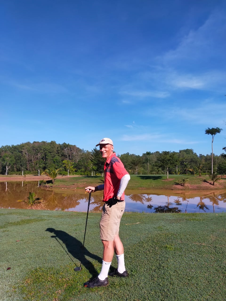 After a very long time, about 6 months, we teed off at Tasik Puteri again. And it was a joy to play. The weather was great, as can be seen from the pictures, and the course was in a good condition. Admittedly some parts were very wet, to the point that I lost a ball just in front of the green, plugged probably half a meter below the fairway.There have been a number of cows/buffalo’s on the course as some of the fairways, and greens, were damaged, but that was OK, as everybody had the same problem. The greens were a bit variable as far as speed is concerned, sometimes very slow and some of them good speed as expected. Again, as in the last weeks, the course was very quiet. Not all golfers have found the way back to the golf course again, it seems.Our regular restaurant was closed, only open for take away, and therefore we enjoyed lunch and beers at the club.