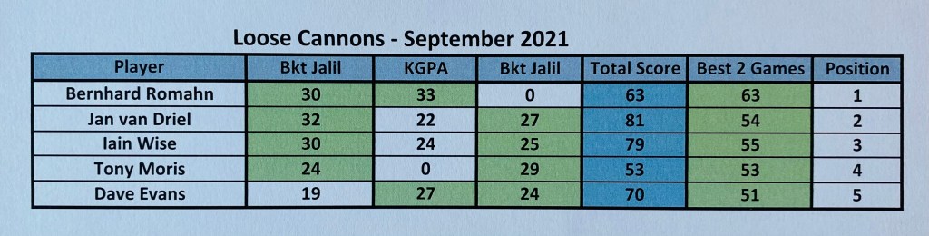 The scores were OK as well, only Tony played to his handicap, which resulted in him ending up in first place (90 – 36). Dave had 105 – 32, Bernard 91 – 32, Iain 99 – 31, Jan 98 – 31 and Robert 113 – 32