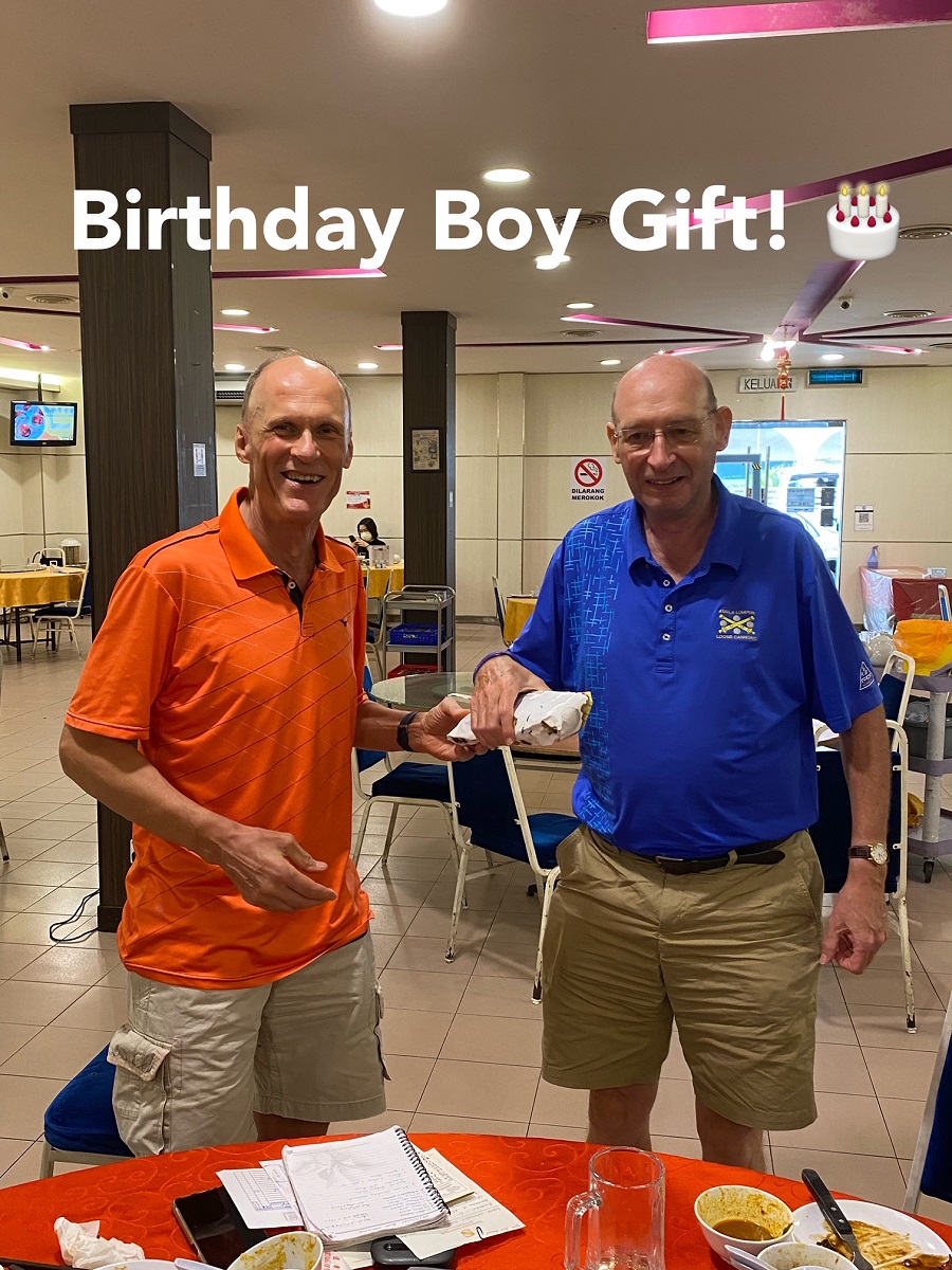 We celebrated Helmut’s birthday (also at his first tee-off….) and thanks to his generous gift, the costs for lunch were kept relatively low. We also celebrated Iain’s birthday, as I forgot last time to take a present with me………