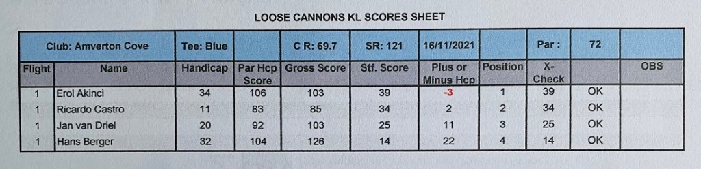 A beautiful morning on a beautiful course. Amverton Cove always is a pleasure to play on. This morning it was particularly quiet. Our small group, 1 flight only, enjoyed the good condition of the course. The greens were very difficult to read. Most of the time very slow, and sometimes faster, which caused us to miss a lot of puts. The one who mastered the course best was our winner, Erol, with 39 points and Ricardo and Jan in second and third place respectively. Erol, congratulations on the voucher! As the course was empty, we teed off early and had a good pace, as a result of which we had an early lunch at ISuka. Driving home was a bit of a challenge with heavy downpours, which caused some delays on the motorways.