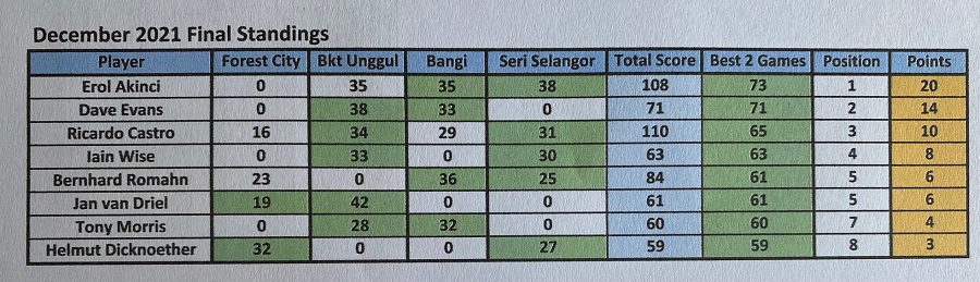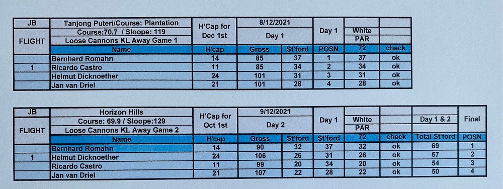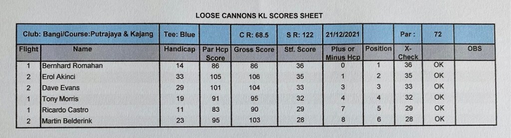 The last game of 2021 was held at the always difficult Seri Selangor. For the last 2 years, they have been doing a lot of work, cleaning renovating the buggies track, and later some renovation at the Clubhouse. The course was in good conditions with difficult greens, sometimes fast, some slow, increasing the difficulty to put and judge the right direction. The winner was Andrew Morrow with a fantastic 95/42 following by Erol Akinci with a great round but not enough to beat Andrew with 103/38 followed by Ricardo Castro with 89/31 adding the lowest score of the day. Following these results, Erold Akinci is the December winner and Jan van Driel is the new LC OF THE YEARD CHAMPION, well done Jan, and congratulations. We welcomed our guest Vind Sidhu for his first game with Loose Cannons and we are looking forward to seeing him more times. Seven of us rushed to Bar Roca joining Andrew Robinson and Barry Cousins for a nice lunch and cool beers. We wish a great 2022 to all our members and hope we can see you guys more often at the golf course. See you all next year.