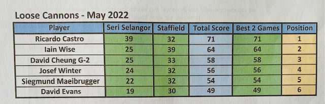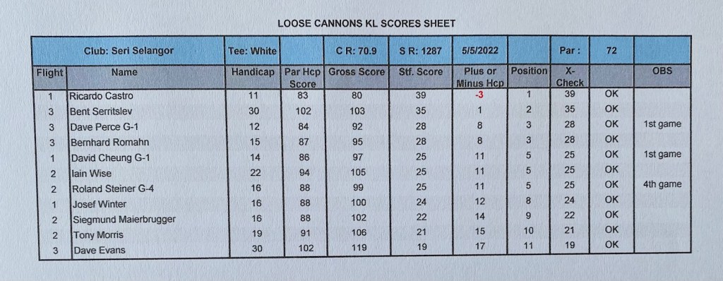It was nice to play again Tasik Puteri, after a long absence and the course (Puteri & Putera) was in a good condition but slow greens, costing a few more extra strokes to everyone. We welcomed Chia to his first game with us (Sleeve of balls as a welcome gift) and congratulations to our new two full members Hans Benn and Roland Steiner (Sleeve of balls, LC Cap, and LC tag as a gift) to commemorate the moment. Also our birthday boy Dave Evans got his late gift (Pair of Puma socks). Great results with only one player scoring below 30 points which reflects how playable was the course today. The winner today was Helmut Dicknoether with an excellent (his best score ever) with 84 for 46 points, followed by Bernhard Romahn in second with another impressive score of 82 for 42 points, and in third place was Ricardo Castro with an excellent 79 for 40 points with one Eagle on his belt (Putera par-five hole # 13) and Hans Berger with an impressive 111 for 40 points (well done Hans). With these results, the May competition shows now in first place Helmut Dicknoether with 85 points followed closely by Ricardo Castro with 79 and Bernhard Romahn with 76, so the last game will be an interesting fight for the monthly winner competition. We all wish safe travels to Dave Evans and Erol Akinci and hope to see you guys soon on the golf course. Next week will be the last game of May at Nilai Springs, so wish you all a great week and stay safe.