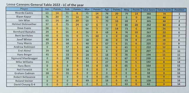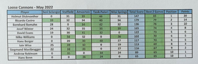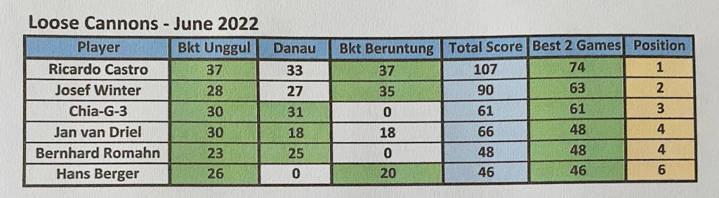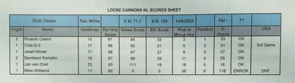 Today we teed off with only one flight. The LC members who decided not to come have missed something. The course was in a good condition and the weather was not too warm. Every now and then some wet patches on the fairways but that was not too bad, and the greens were very good and most of the time difficult to read. So an extra challenge. The winner today was Ricardo Castro with an excellent score of 81 gross with 37 points. The second was Josef Winter with a respectable 90 for 35 points followed by Hans and Jan. With these results the LCOTY standings Ricardo still leading with a comfortable 74 points followed now by Josef Winter with 63 points. Today we skipped our normal lunch due to some last-minute duties in KL. Next week we plan to play Staffield and we hope more Cannon’s can join and make better numbers for our last game of June. Stay safe and see you guys next week.