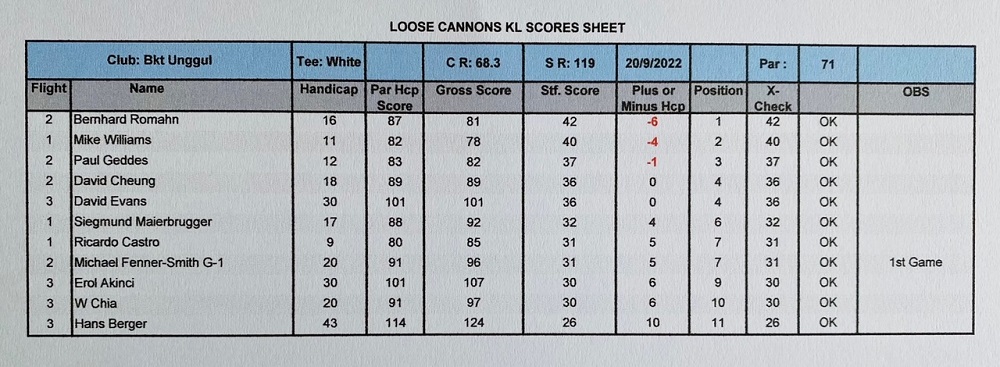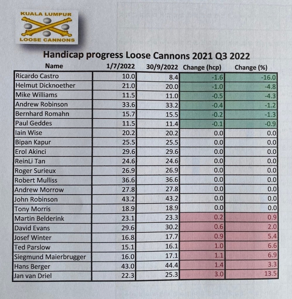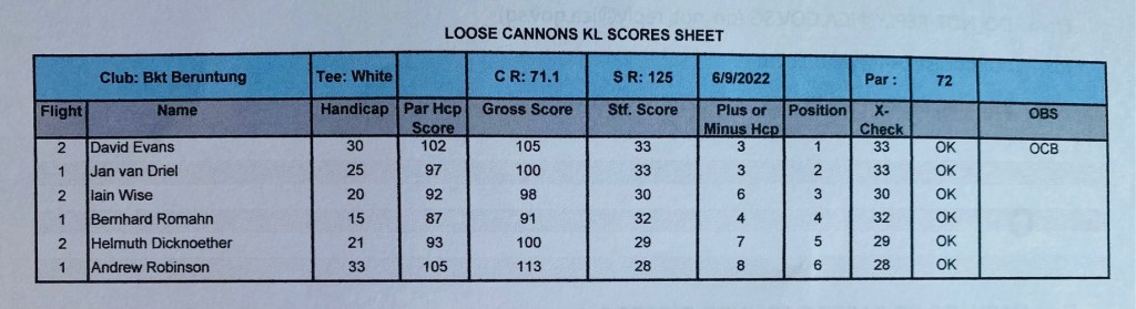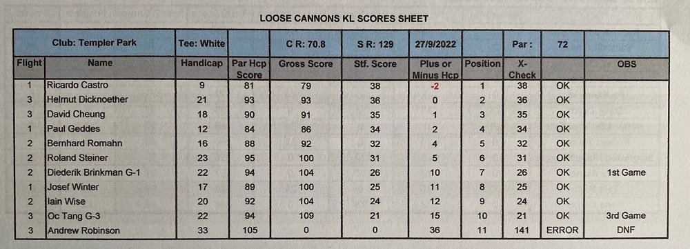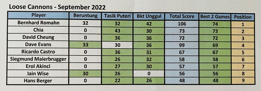 Always a pleasure playing at Templer Park and getting involved with the majestic landscape around the 18th holes. The course is always in a good shape with changeling greens and difficult pin positions, making many of us increase our number of puts, but overall a great course to play many times. We welcomed a new guest, Diederik Brinkman, introduced by Roland Steiner, and he got an LC sleeve of balls as a gift for his first game with us and we are looking forward to seeing him again very soon. Oc Tan also played his 3rd game and just needs 2 more games to become a full member. The winner today was Ricardo Castro with an excellent 79 for 38 points, followed by Helmut Dicknoether with 93 for 36 points, and in 3rd place was David Cheung with 91 for 35 points. With this final monthly game results, Ricardo Castro and Bernhard Romahn finished in first place with 74 points, and Bernhard became the September winner because from the best 2 games between the 2 players, because he had the highest score on of the his best games of 42 points, so congratulations to Bernhard, and well done. For the LC player of the year competition, Ricardo Cemented, even more, his first position, now with 132 points, followed now by Helmut with 52 points who relegated Bipan and Iain to the third position booth with 48 points. Next week let’s welcome October games at Staffield and stay safe.