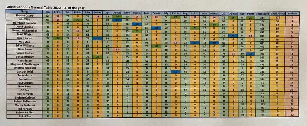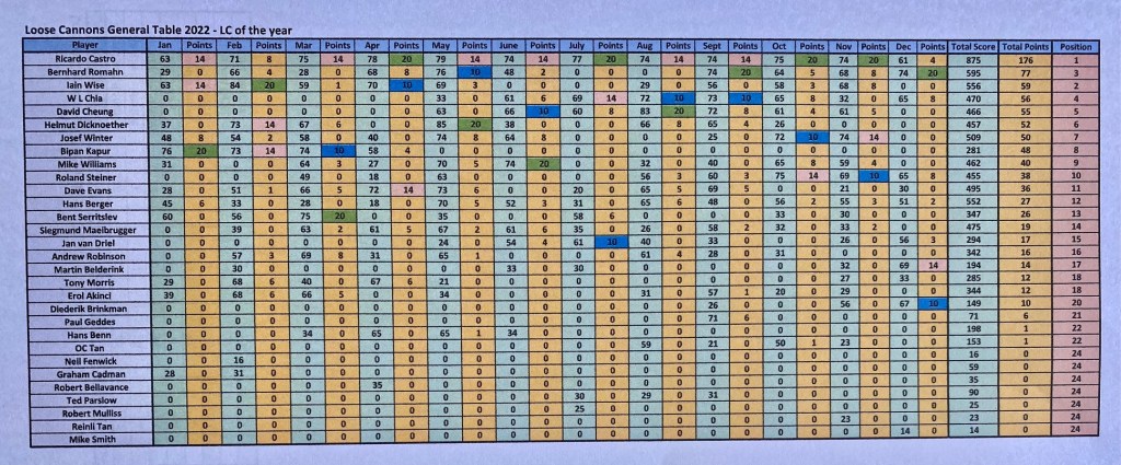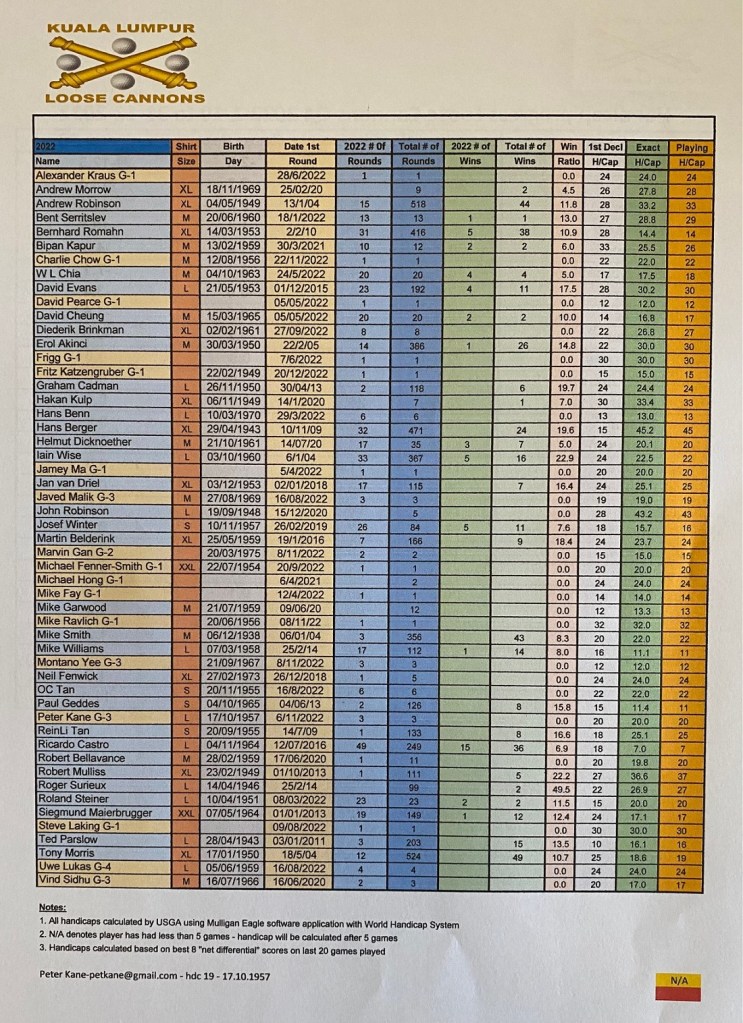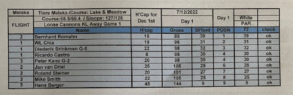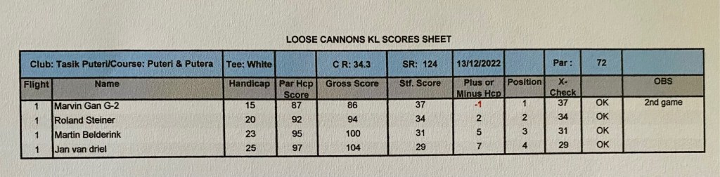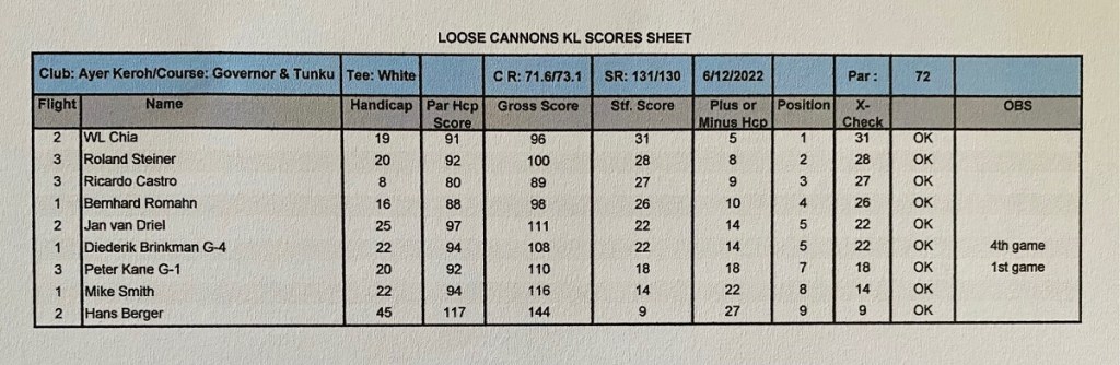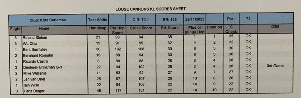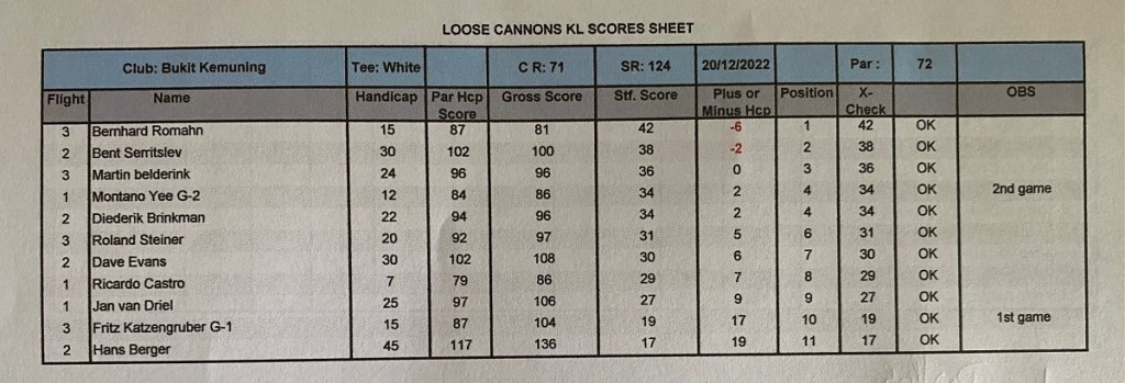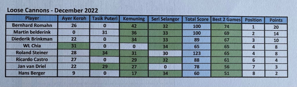 The last game of 2022 was held at Seri Selangor with a busy morning tee-off and overcast weather. We started on hole 10 with 2 flights in front of our group and in the first 10 holes the pace was reasonable, but after 12 holes all the long waiting started because the jumbo flight had some issues on par 3, and two to three flights starting to waiting for every hole until the 18th. It’s ridiculous how the club allows the jumbo flight to be the first one to tee off and soon or later it will be a big mess and long waiting. Anyway, back to the real golf, the course was nice and surprisingly dry with nice greens but always very tricky. Uwe Lukas played his 4th game and Montano his 3rd game with us. The winner today was Chia with 92 for 34 points, beating Hans Berger OCB followed by Tony Morris and Martin Belderink booth with 33 points. With these results, Bernhard Romahn wins the December competition with 74 points, followed by Martin Belderink with 69 (nice number) :-)))) and in third place Diederik Brinkman with 67 points. With this win, Bernhard consolidated second place in the LCOTY competition with 59 points passing Iain Wise who finished third with 56 points. The LC Player of the Year is Ricardo Castro with a record of 176 points closing an amazing year with four-time first place and six-time second place with a total of 49 games. The fourth of us had a good lunch at the Beer Factory. New year, new life, and hope more members can play more often and make this annual competition even more interesting. 2022 was one of the best years, if not the best year of LC history, with 12 new members, a new sponsor, a new shirt, interesting prizes, and gifts, great away games, good friendships, and an average of 3 flights every week which shows our society is alive and growing every year with new blood, given us the warranty for the future of the LCKL. Happy New Year to all and see you guys at Impian and open 2023 in style.