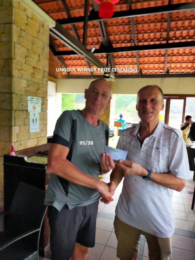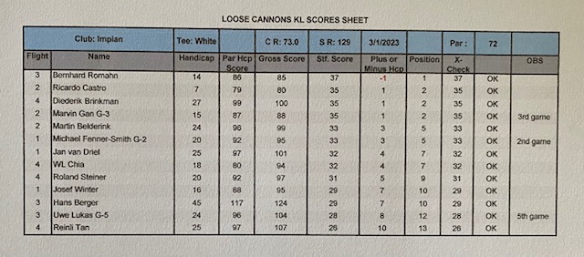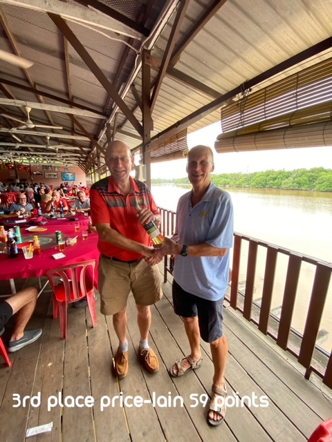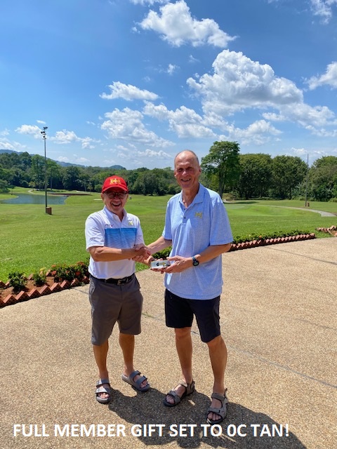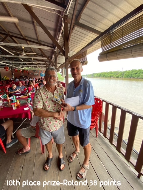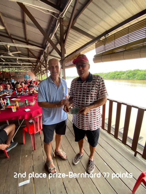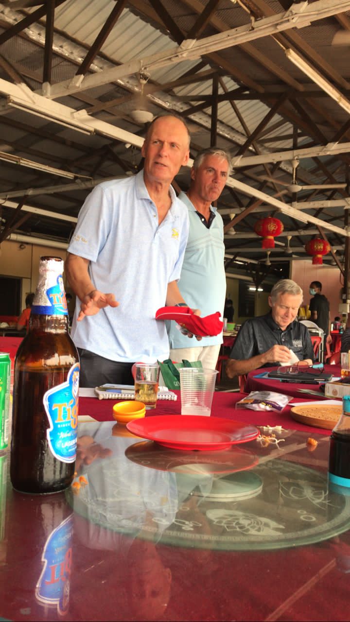 We gave prizes to the top 10, and for the others, we had a lucky draw. Number 10 was Roland, good for a sleeve of balls, numbers 9 and 8 (Mike and Bipan) were not present. Josef with number 7 won a pair of socks. Numbers 6 and 5 (Helmut and David Cheung) were not present. Chia with number 4 won a Loose Cannons 2023 cap. Iain, in the 3rd place, won a bottle of wine. Bernhard was number 2 good for 100 RM and the winner overall for last year, and therefore the Loose Cannon Of The Year 2022 was Ricardo!! He received the trophy with his name on it and a special shirt.