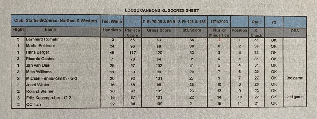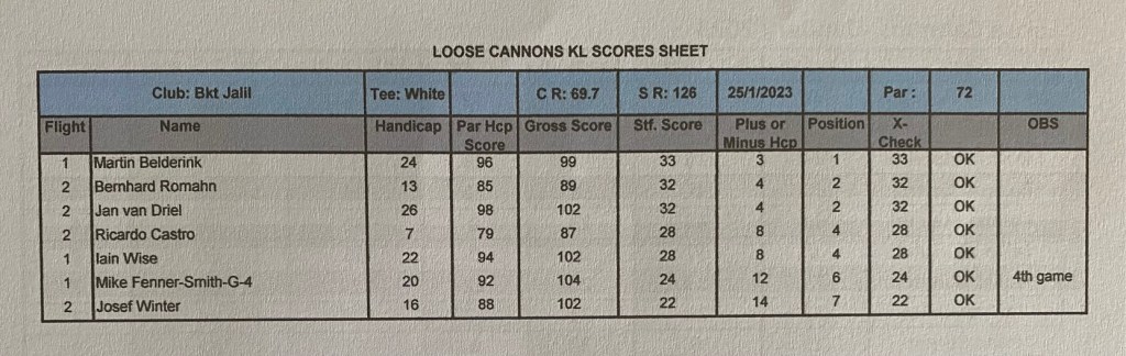 The scores were good today. Four players ended up with 37 points, but Bernhard won OCB (again….) on count back and took the RM 50 back home. Martin, Diederik, and Chia were the others with 37 points. With these results, Bernhard is the January winner with 75 points (the best 3rd score), followed by Diederik also with 75, and in third place Martin with 73.