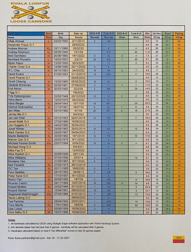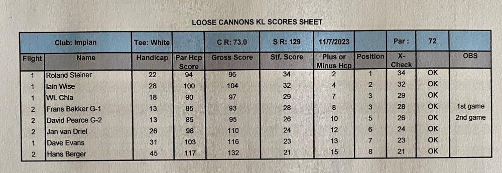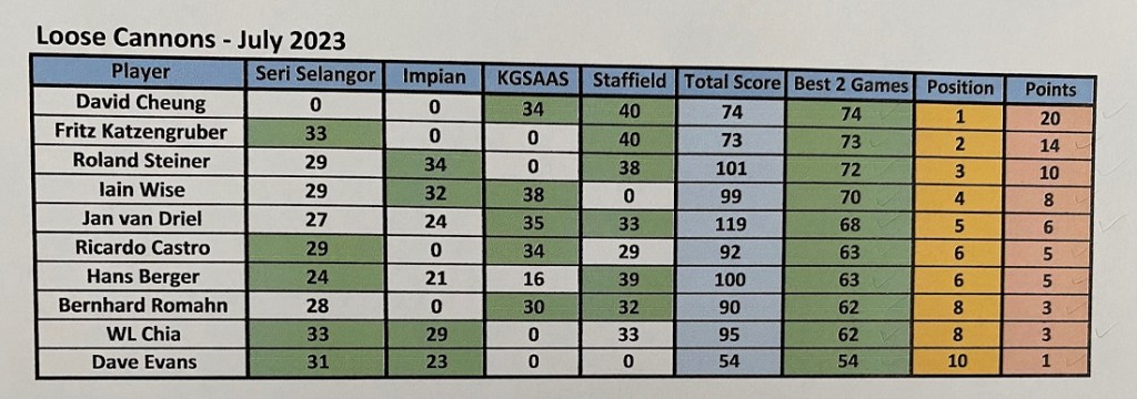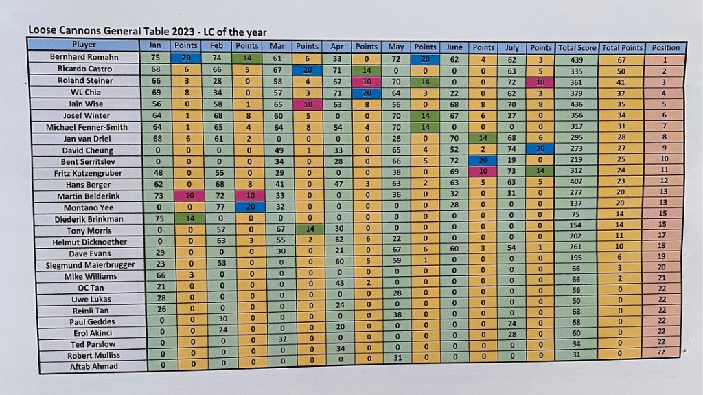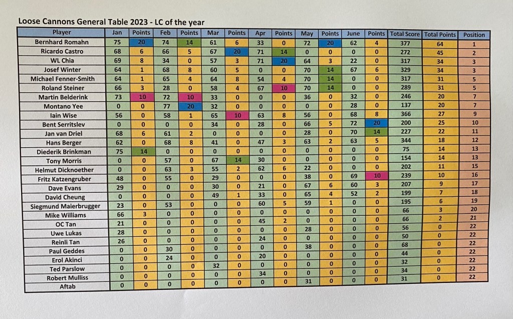 As said, the scores were good. The lowest gross score was this time for David with 86. The third place was for Hans (!!) with 39 points. A shame that he got some problems with his hand otherwise the winnings would be for him. The first and second places were shared between Fritz and David with each 40 points. David won the 50 RM on countback. He had 23 points in the last nine. With these results, David Cheung is the July champion with 74 points followed by Fritz Katzenbruger with 73, and closing the podium Roland Steiner with 72, so quite competitive until the last hole. For the LCOTY competition, Bernhard Romahn still leading the pack now with 67 points, followed by Ricardo Castro with 50, and in third place is another German, Roland Steiner with 41 points, so a lot to fight until the end of the year.