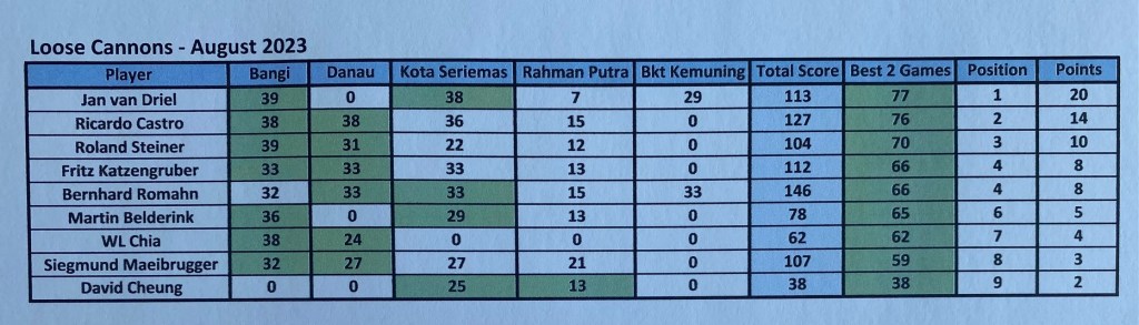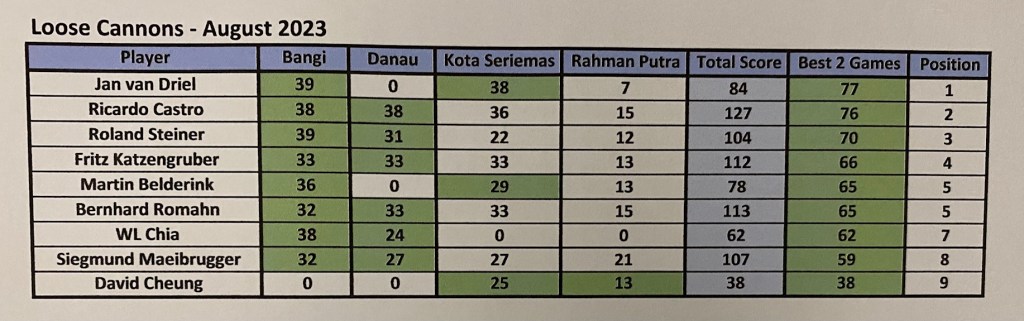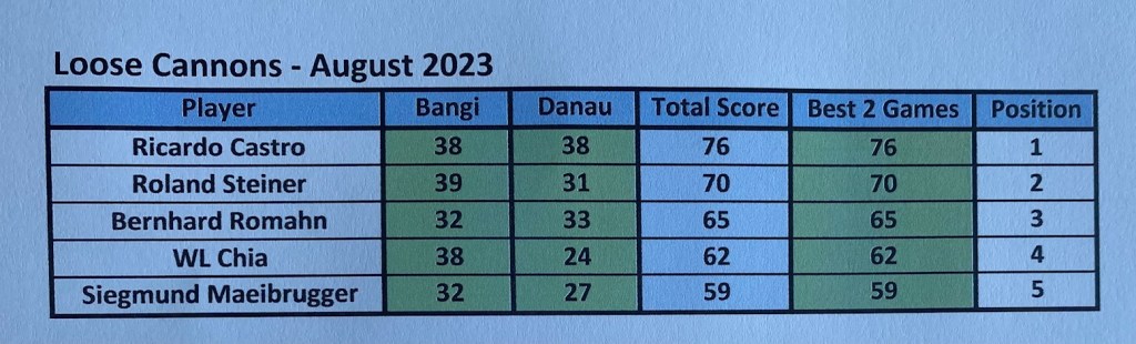 Markus with his 3rd game, finished fourth with 22 points, Jan third with 29 points, and Dave with 32 points had to leave the first place to Bernhard with 33 points. With these results, Jan won the August competition with 77 points beating Ricardo by 1 point, and in third place Roland with a reasonable 70 points. For the annual competition, Ricardo keep chasing Bernhard, now with only 11 points separating the first and second place, followed in third place by Roland with 48 points, and with the last 4 months’ games all still open for the podium.