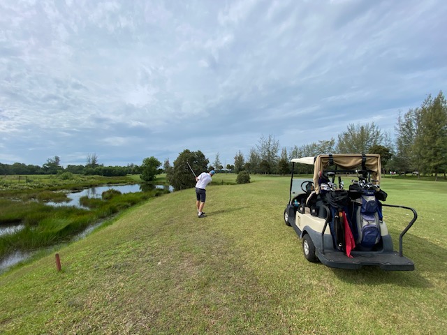 The weather was OK, although after 14 holes we had to take shelter for some 15 minutes to let the rain pass, and we could finish the full 18 holes.