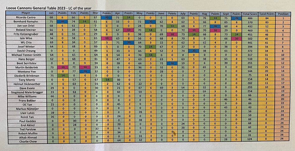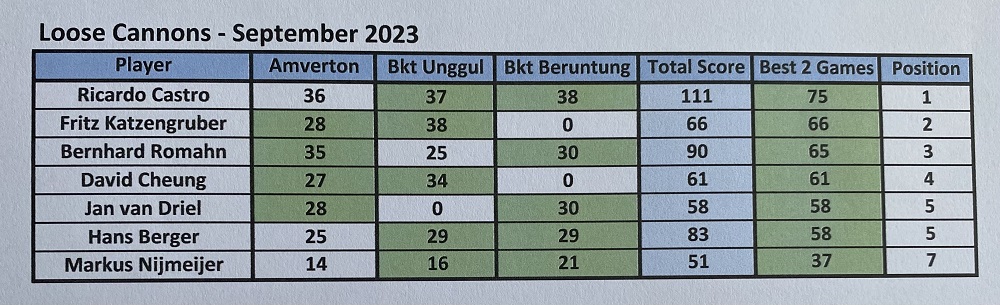 The third place today was for Fritz with 35 points, Hans was really on the shot with second place with 36 points, and Iain topped everyone with 37 points. Well done Iain!! With these results, Ricardo is the September Champion with 75 points, second Fritz with 73, and third place Iain with 66 points. For the annual competition, Ricardo now with 84 points passed Bernhard and leading now by 1 point, and in third place, is now Jan with 51 points, so all are open for the last 3 months’ games.