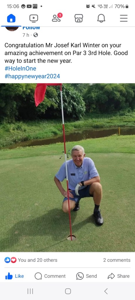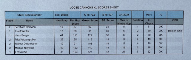 Despite a few unexpected twists, our golfing adventure turned into a memorable day. We initially planned for two full flights but, unfortunately, had to adjust due the Ricardo’s positive Covid test. The recent heavy rain left the course a bit soggy, especially on the first 9 holes (hole 10 to 18), resulting in lots of plugged and lost balls. Nevertheless, the spirit remained high, and Bernhard emerged from the ashes victorious with an “impressive” 92 for 31 points, followed by Josef with a 95 for 30 points. The highlght of the day was the HOLE IN ONE by Josef Winter, even fighting with the jet leg, he manage on the challenging hole # 3 (125 m) with a 9 iron to rock the baby straight to the hole and marked a great kickoff to the new Loose Cannons season of 2024. To report at the club is archivment, it feels like more difficult than do a hole in one due the heavy burocracy filling up so many papers with the same information and the options are, 1500 MYR lunch at the club (same day) or 500.00 MYR in cash to be paid around March, and obviously he choose the second option. Any way Josef went thru all this papper work and he manage to join on time everyone at the Beer Factory for lunch and kindly handle the bill to commemorate is archivment. Well done Josef.