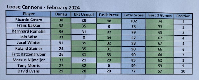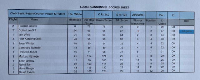 After more than one year we are back to playing Tasik Puteri. Finally, they decided to start using again the traditional booking system and not using MyGolf2you App, I think they realized they had been losing a lot of guests. Registration is now a pain in the ass because they need to input into the system one by one ID card for Seniors, get a code, print all the cards, and then I can pay, which took me around 20min. Also, the very small number of caddies, not like before, and course conditions are much worse than 3 years ago. I hope they can improve the course maintenance to recover the fairways otherwise, it will get worse and worse, but we did enjoy playing Tasik again. The weather was overcast most of the time with some breeze and only sometimes did the sun say hello, and was very hot for a moment. We welcomed Collin Lee for his first game and presented him with a welcome gift an LC sleeve of balls and we are looking forward to seeing him more times. The winner today was Ricardo Castro playing his hdc with 78 for 36 points, second place was our guest (because as a guest can’t be the winner), Collin Lee with a nice 95 for 37, and in third place was Iain Wise with a reasonable 98 for 34 points. With these results the February competition sees now Ricardo in first place with 74 points, followed closely by Frans Bakker with 73, and Bernhard close the top three with 68 points. Lunch at the club, Fritz contributed 150.00 Rm for the bill, celebrating his birthday in advance with us and he will get his gift next week. Batam trip is just around the corner, but before that, get ready for the last game of February at Impian.