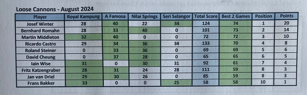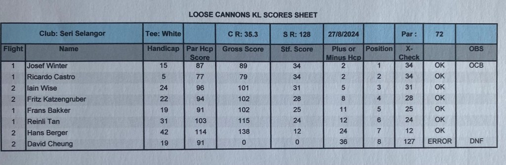 Back to Malaysia’s most haeted golf course, with three full flights starting from hole # 10. The course was in good condition, but we had to fight with sandy greens for the first nine, and the weather was hot and humid. The winner today was Iain Wise with 34 points, beating Tony Morris OCB, and in third place was Hans Berger with a nice 116 for 33 points, even playing from the blue tees. With these results the monthly winner is Jim Stevenson with 73 points, second place Ricardo Castro with 72, and in third place Fritz Katzengruber with 69 (nice number). For the LCOTY competition, Ricardo Castro cemented his first position, with 108 points, followed by Bernhard Romahn with 86, and third place, Josef Winter with 76 points. October games will be decisive for the final standings. We had lunch at East of Highway and to celebrate his departure for good to Hua HIn, Bent Serritslev contributed 250.00 Rm for the bill. We all wish him a happy life in Thailand and when you back to Malaysia, LC group is your home. As you know next week, we will be playing in JB for our 2024 away games.