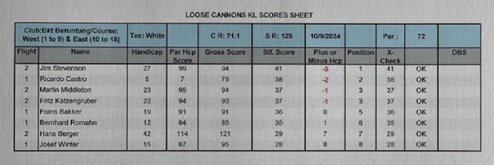 Back to North to play Bkt Beruntung with 2 full flights. The weather was nice and cool during the first nine, but when we were ready to start the second nine, we saw black clouds and in 5 minutes we had a big storm and had to go back to find shelter for about 30 minutes. After the storm, the weather was again nice and cooler until we finished. The course was in nice conditions with perfect greens and we all enjoyed the round. Today’s winner was our new member, Jim Stevenson with an excellent 94 for 41 points, Ricardo Castro (lowest gross) also with a solid 71 for 38 points finished in second, Martin Middleton and Fritz Katzengruber ended up in third place booth with 37 points. Full Moon was again our restaurant choice, for a good and affordable meal. Next week KGSAAS is on Thursday the 19th due to the Tuesday Public holiday.
