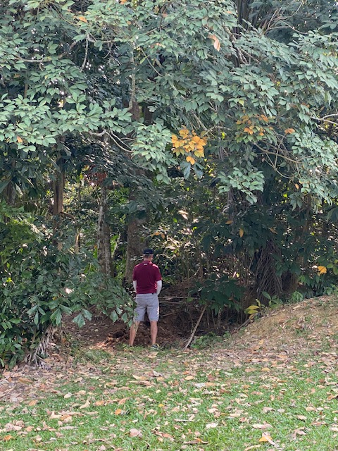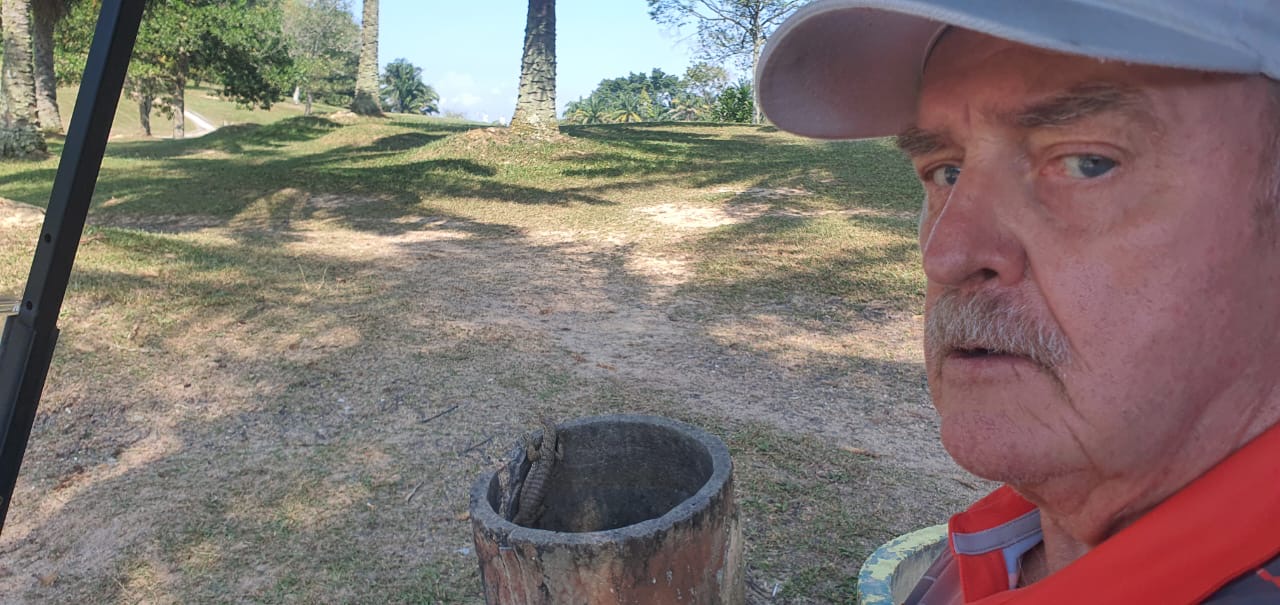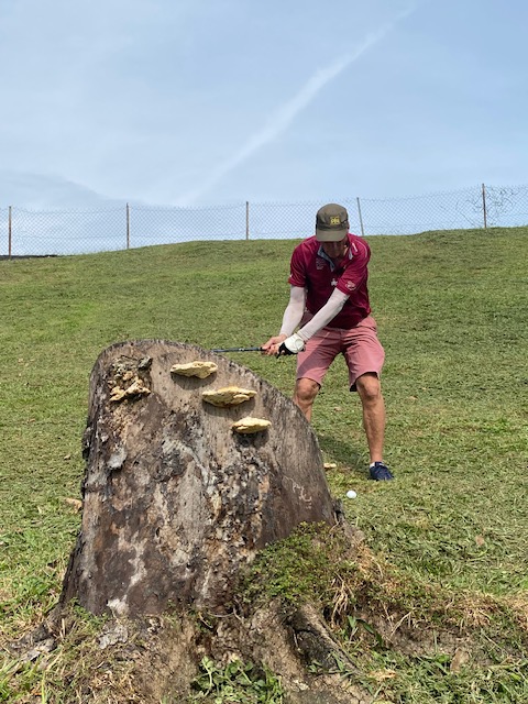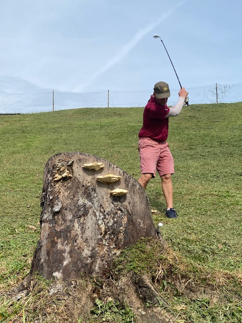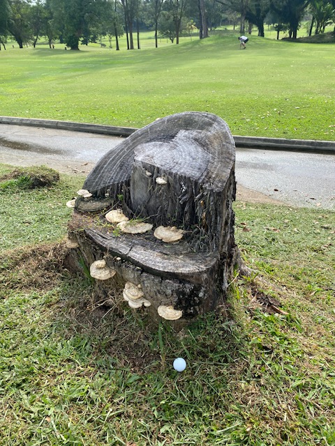 DEAD TREE, WILD MUSHROOMS, GOLF BALL AND THE PLAYER, WHAT A COMBINATION.
