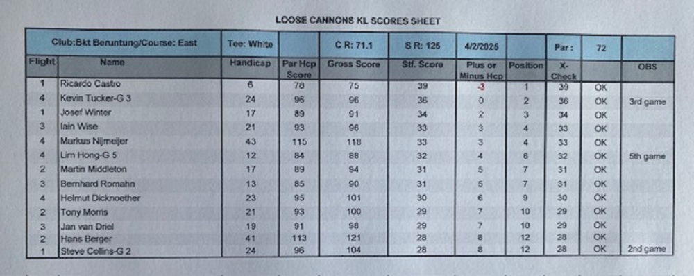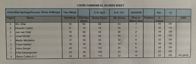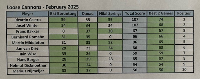 Before the Bintan tour, we had the third game of the month at Nilai Springs. We played the Pines nine first and then crossed to the Mango nine. The weather was overcast most of the round, only the last hour being very hot and sunny. The Pines course was wet and challenging, and the Mango course was the opposite conditions with both nines with excellent greens. Steve Collins played his third game. The winner today was WL Chia with an excellent 83 for 43 points, followed by Ricardo with a solid 79 for 35 points, and in third place, Jan van Driel and Josef Winter both with 34 points. With these results, Ricardo still leads the Monthly competition with 74 points, Josef Winter second with 68, and Frans Bakker third with 67 points. Fritz Katzengruber contributed to our lunch bill with 200.00 rm, to celebrate his birthday and he got his deserved birthday gift + the LCOTY 6th place prize. On Saturday we are off to Bintan, and I’m looking forward to seeing you all on the 4th of March.