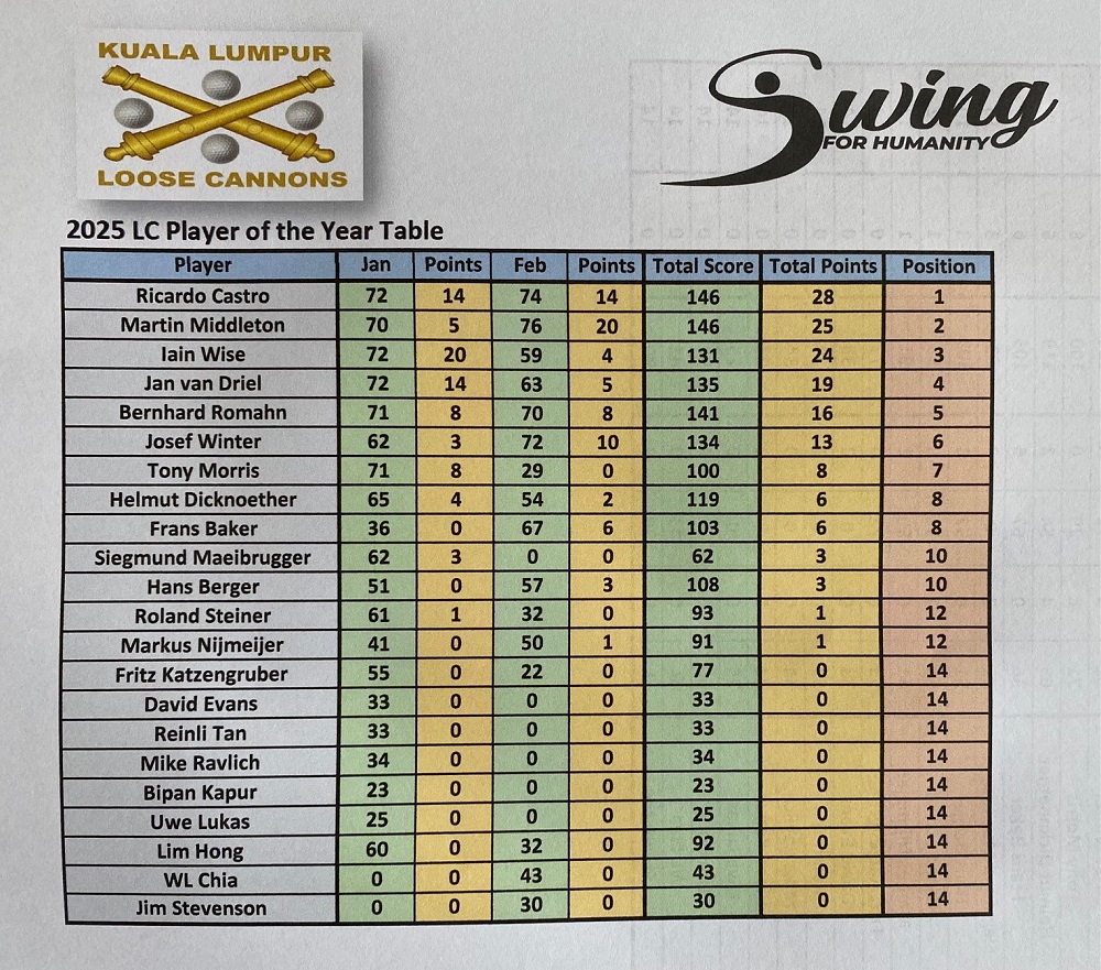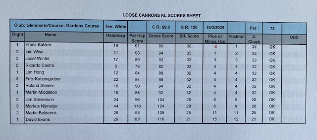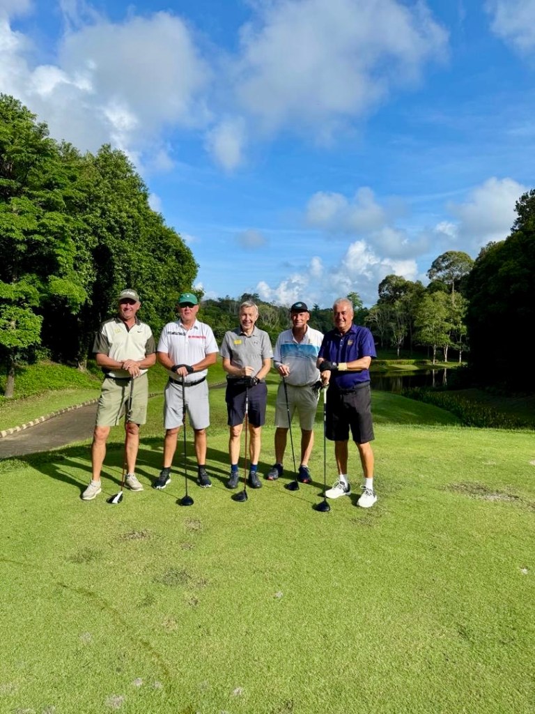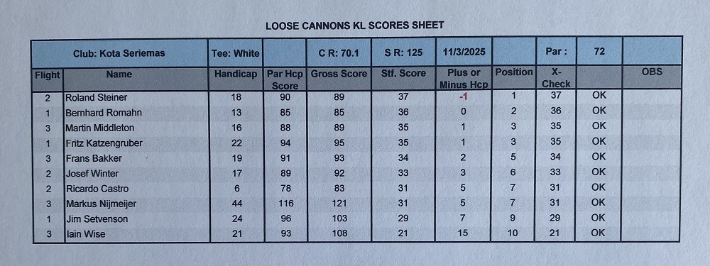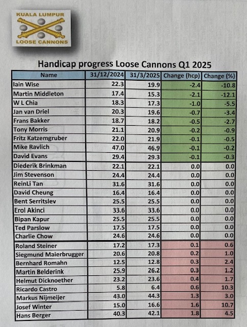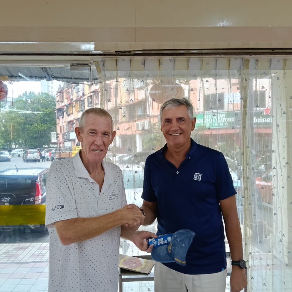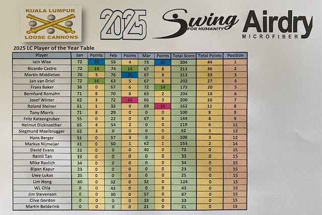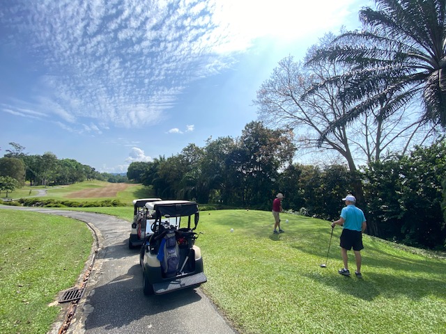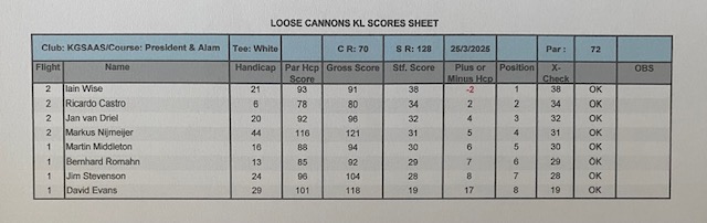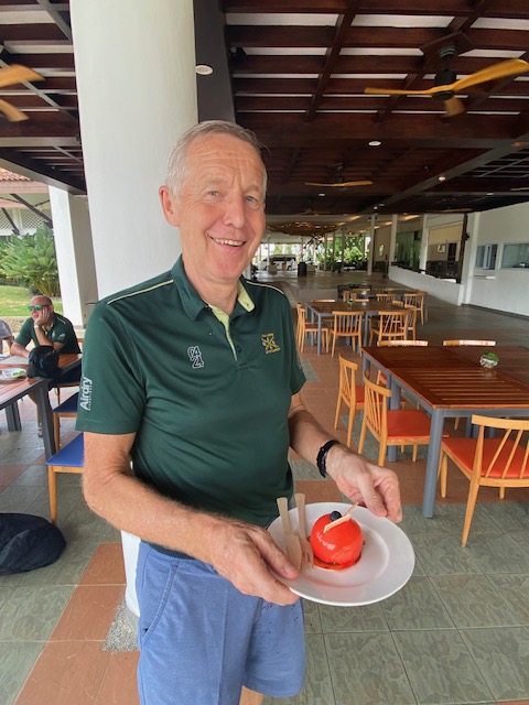 The last Ramadan game was held at KGSAAS, with humid weather and dark clouds all morning, but luckily we ended up the round dry and happy. Two flights started on President Nine, crossing over to the Alam Nine, at a fast pace as the course was empty and we all finished before 11:30 am. The course was wet with some plugged balls but overall was playable with slow greens on the first nine, but Alam course the greens were sandy and quite fast. The winner today and following his good form was Iain Wise with a solid 38 points, second was Ricardo Castro with a reasonable 80 for 34 points, and in third place, Jan played 96 for 32 points. With these results, Iain Wise is the March champion, beating Frans Bakker (72) on the last turn with a nice 73 points, and Roland Steiner in third place with 69 points (nice number). For the annual competition, Iain is now leading with 44 points, second is Ricardo with 36 points, and in third place is Martin Middleton with 33. We finally celebrated Bernhard Romahn’s birthday and he made a generous contribution of 200 rm to our bill, and he got a nice PING cap and one LC sleeve of balls as a birthday gift. Next week we will be playing Seri Selangor on Thursday 3rd of April due to the Hari Raya festivities.
