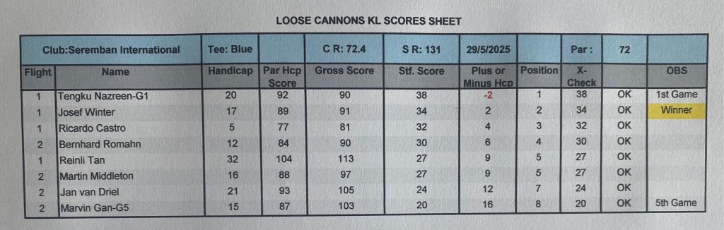 Due to the special traffic restrictions in KL during this week, the game was moved to Thursday to avoid any problems with road and highway blocks, and Seremban International was the choice for our last game of the month. Two full flights started on hole # 10, before 8:00 am with quite dark clouds in front of us, and strong wind, bringing some rain between hole 17 and hole 4, finishing the round with a nice cool weather. We had the honor to play with the club Vice-President Mr. Tengku Nazreen (Reinli’s freind) who help me to organize the game and lunch with VIP service and a big thank you for his hospitality and friendship. It was challenging to play this course from the blue tees, very dry fairways, running quite hard, getting a bounce and ending up a yard off, and in a horrible lie happened a few times, lots of traps specially on the back nine where is easy to find small pounds and water drainage all the way. The greens were difficult to put, due to the pin position and tricky lines, but everyone enjoyed playing this course and for sure, we will be back soon. We also celebrated Marvin Gan his 5th game, and he got a special gift and now he his a full LC member. Mr. Nazreen had 38 points, but following our rules, no win for guest until they became a full member, so Josef Winter was the official winner with 90 for 34 points, second place was Ricardo Castro with 32 points, and in third place was Bernhard Romahn with only 30 points. With these final results, Ricardo is the May champion with a solid 81 points, followed by Bernhard with 69 and in third place, Jan van Driel with 66. For the Player of the Year competition, Ricardo reinforced his first position, now with 76 points, Iain Wise is second with 47, but very close are now Bernhard with 46 and Martin Middleton with 45 points. With almost half year played, we still a lot to play and lets open the June competition at Bkt Kemuning.