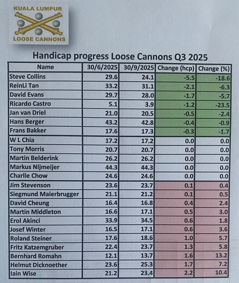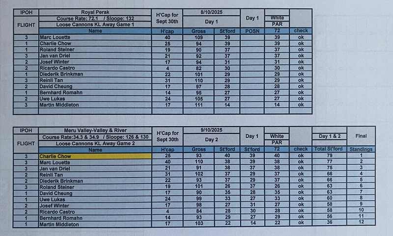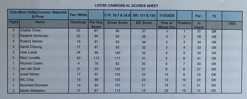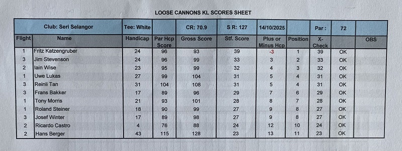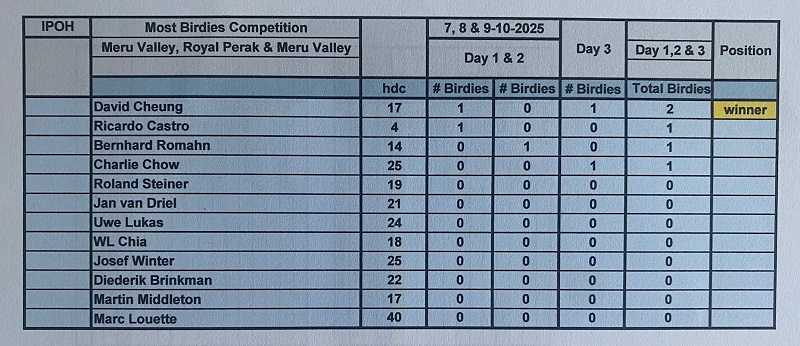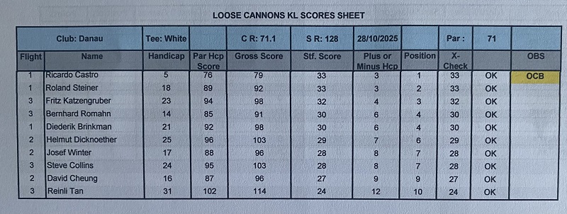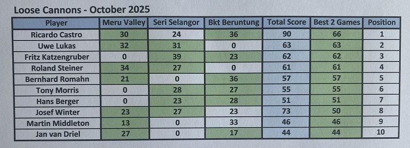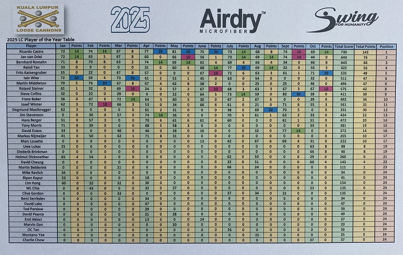 The last game of October was played at one of the most hated golf courses in KL, either because it’s to soggy or wet, or because the greens aren’t fair, or because the pin position is ridiculous, or because the hole # 2 has a very strange layout, or because it’s to dry and maybe because the quality of the grass, or maybe the sunrise is not so nice comparing to other courses. These are the excuses for some of our high-level members give, which Danau not meeting such quite high expectations. Any way I always enjoy to play Danau and I believe most of us have the same feeling. The course was dry with playable fairways and yes the greens were very fast with difficult pin positions, but gentleman that is the beauty of golf, playing different courses with different challenges, different layouts, different greens speed etc…etc….etc….making these difficult challenges easier to overcame, appreciate the moment, and think about how lucky we are to be able to play golf every week regardless of the golf course. Back to the main subject, the winner today was Ricardo Castro beating OCB Roland Steiner (92/33) with a solid 79 for 33 points, and in third place was Fritz Katzengruber with a nice 98 for 32 points. With these final results Fritz are the October champion with 71 points, followed by Ricardo with 69 (nice number) and in third place Roland with 67 points. For the LCPOTY and only two months to finish 2025 Ricardo solidified the first place now with 142 points, second still Jan with 76 and Bernhard is now third with 66 points. Diederik paid a visit from Singapore and hope see you soon again. We also celebrated Helmut Dicknoether birthday with a nice box of balls and he contributed with 200.00 rm to the bill. Lunch was good with excellent food and thank you again to Chia for helping me to organize the dishes in advance and secure the private room. It was a very intense and interesting month with our trip to Ipoh, and lets end the years beautifully.