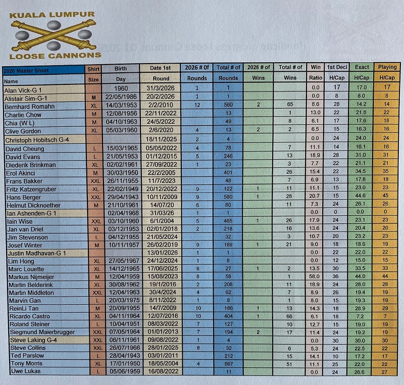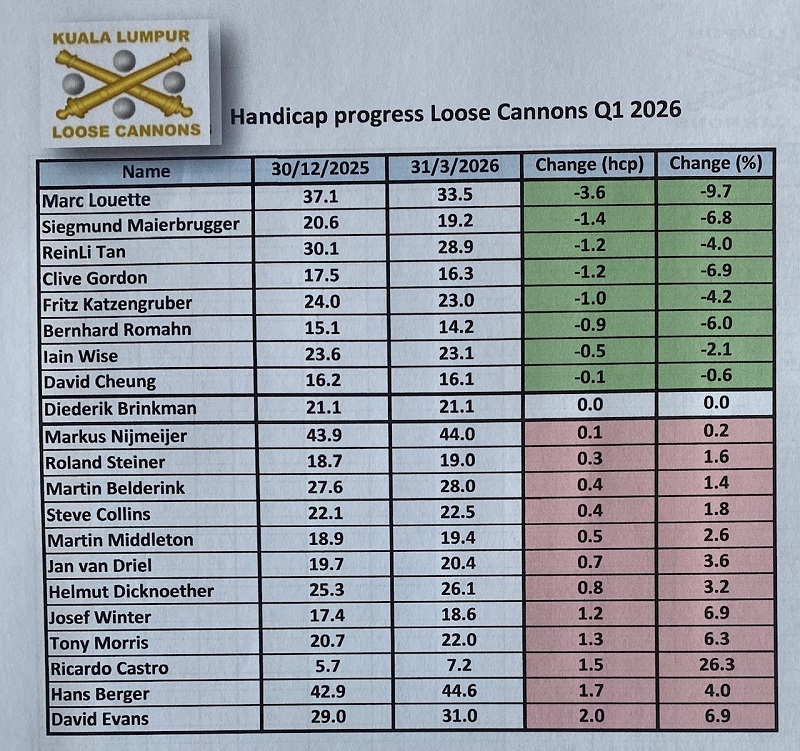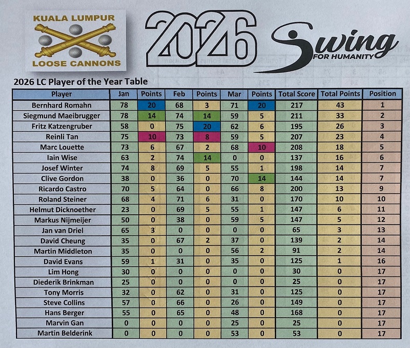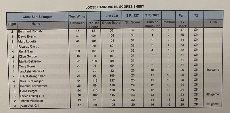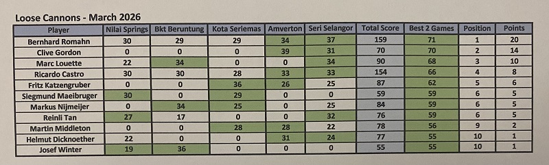 Back to KL to close out the month of March competition playing in the always difficult Seri Selangor course. We had four full flights with 3 guests, Ian Ashenden and Alan Vick playing their first game and Steve Laking playing his fourth game with us. Ian and Alan they got a LC sleeve of balls as a welcome gift. Flight one and two started on hole 1 and flight three and four started on hole 10th. With a quite big numbers of flights on the course we were able to fininish the game in 4:15 min, so not so bad as the last time. The winner was Bernhard Romahn with a very good score of 86 for 37 points, followed by David Evans with a nice 35 points, and in third place was Marc Louette with a good 34 points. With these results Bernhard is the March champion with 71 points, one more than Clive and in third place was Marc with 68 points. This month was a close competition from the first till to the last game even the numbers were not to high. See you guys in Bkt Kemuning for the first game of April.
