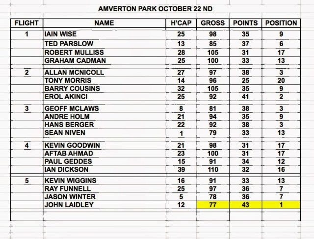 The scores reflected the course and the conducive playing conditions. 75 % of the players were under the 100…. The winner, with also the day’s lowest gross, was John Laidley with an excellent 77 for 43 points. I had the good fortune to watch his great round. For his efforts John is cut 7…. Second place was Erol Akinci with 92 for 41 points cut only 1….. Full results attached.