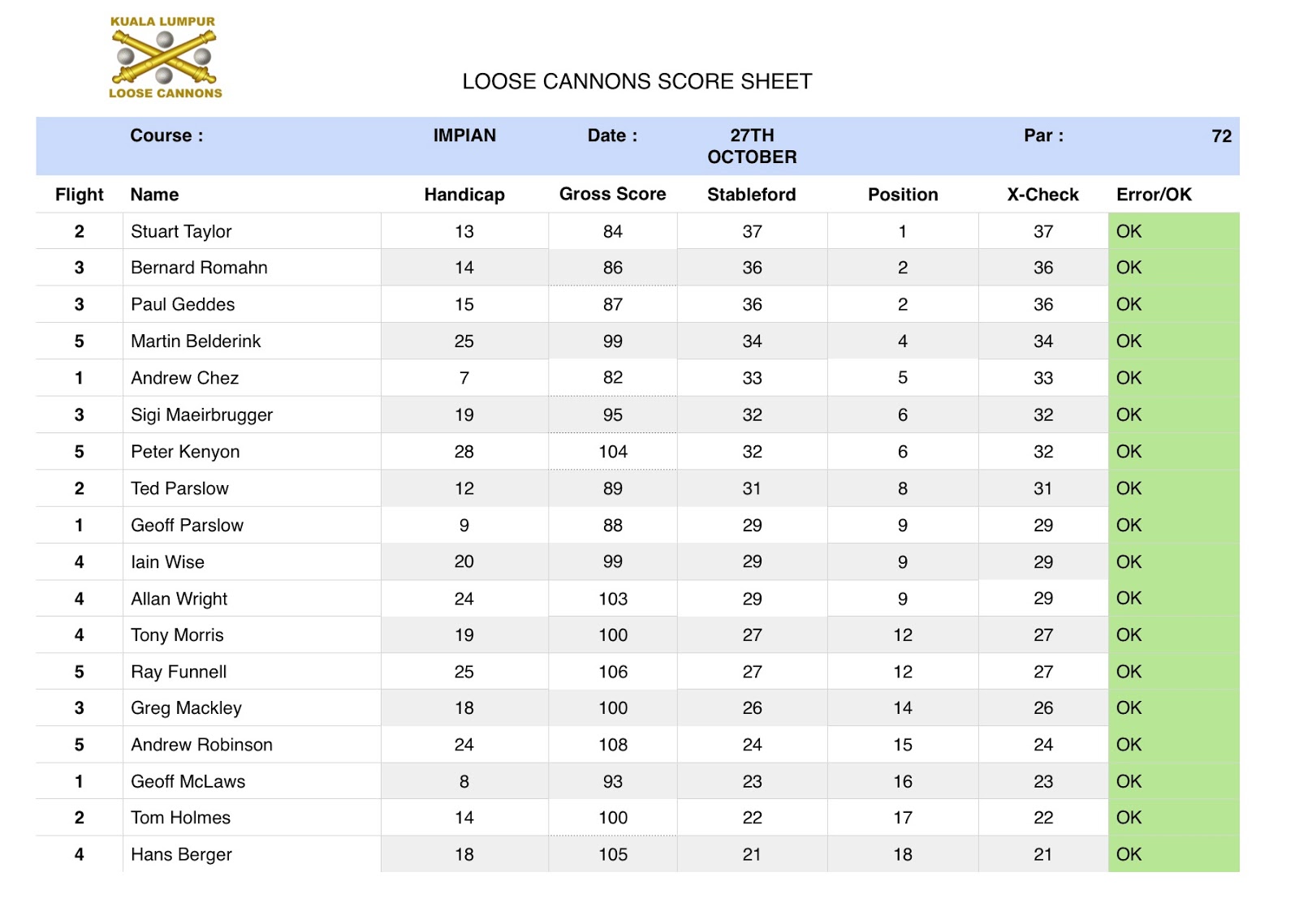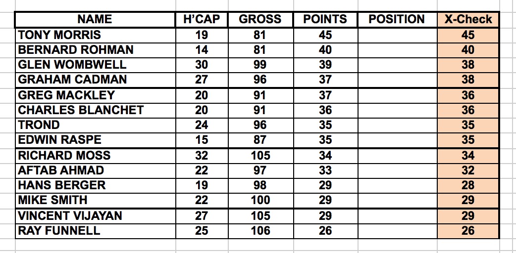 Scores were relatively low this week and the October Monthly Trophy winner with 37 points and a gross of 84 was Stuart Taylor. Runner up was Bernard Romahn with 36 points on count back from Paul Geddes also on 36 points. Best gross of the day was Andrew Chez with an 82. Full results below :