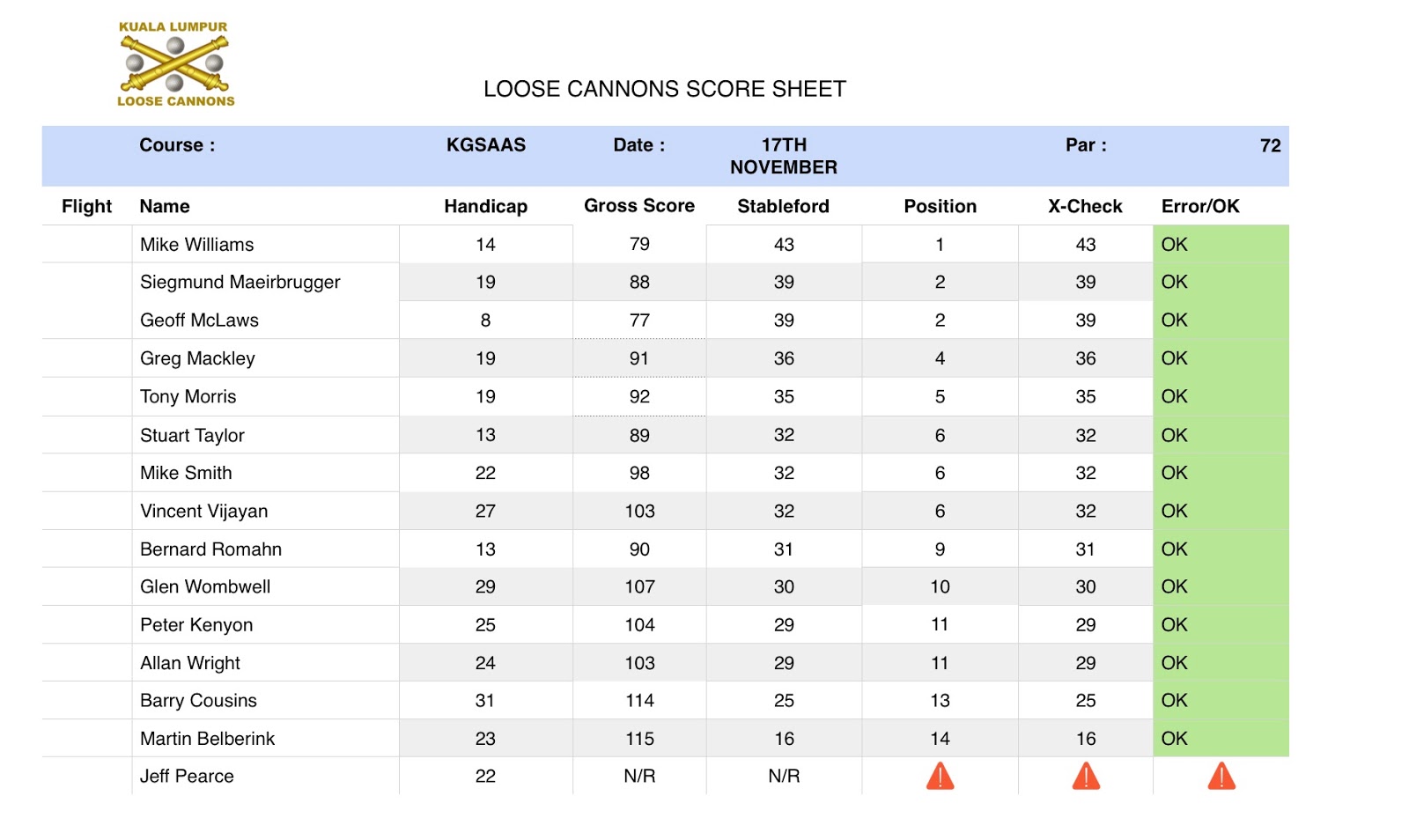 The winner today and the November Trophy winner with 31 points and a gross of 91 was Bernard Romahn, beating Geoff McLaws on count back who also scored 31 points and the best gross of the day of 85. Full results are below :